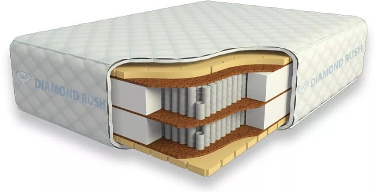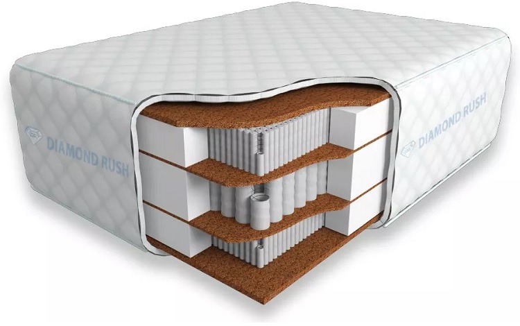 - Diamond Rush Full Cocos-2 : 50 cm, charge maximale 150 kg. Trois blocs à ressort. Durée de vie plusieurs fois plus longue grâce à la présence de 110 ressorts par 1 m². m, quatre couches de noix de coco, dureté élevée.