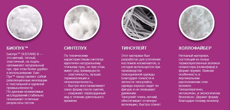 - Synthétiques unis. Ces appareils de chauffage sont très résistants à l'humidité, ils gardent au chaud même après avoir été mouillés, alors qu'ils ne se déforment pas et sèchent assez rapidement. Les synthétiques sont faciles à entretenir car ils ne nécessitent pas de techniques spéciales de nettoyage et de séchage. En tandem avec une couche extérieure imperméable, la charge est idéale par temps frais et froid. L'inconvénient du matériau est qu'il n'est pas aussi chaud que le duvet et aussi compact une fois plié.