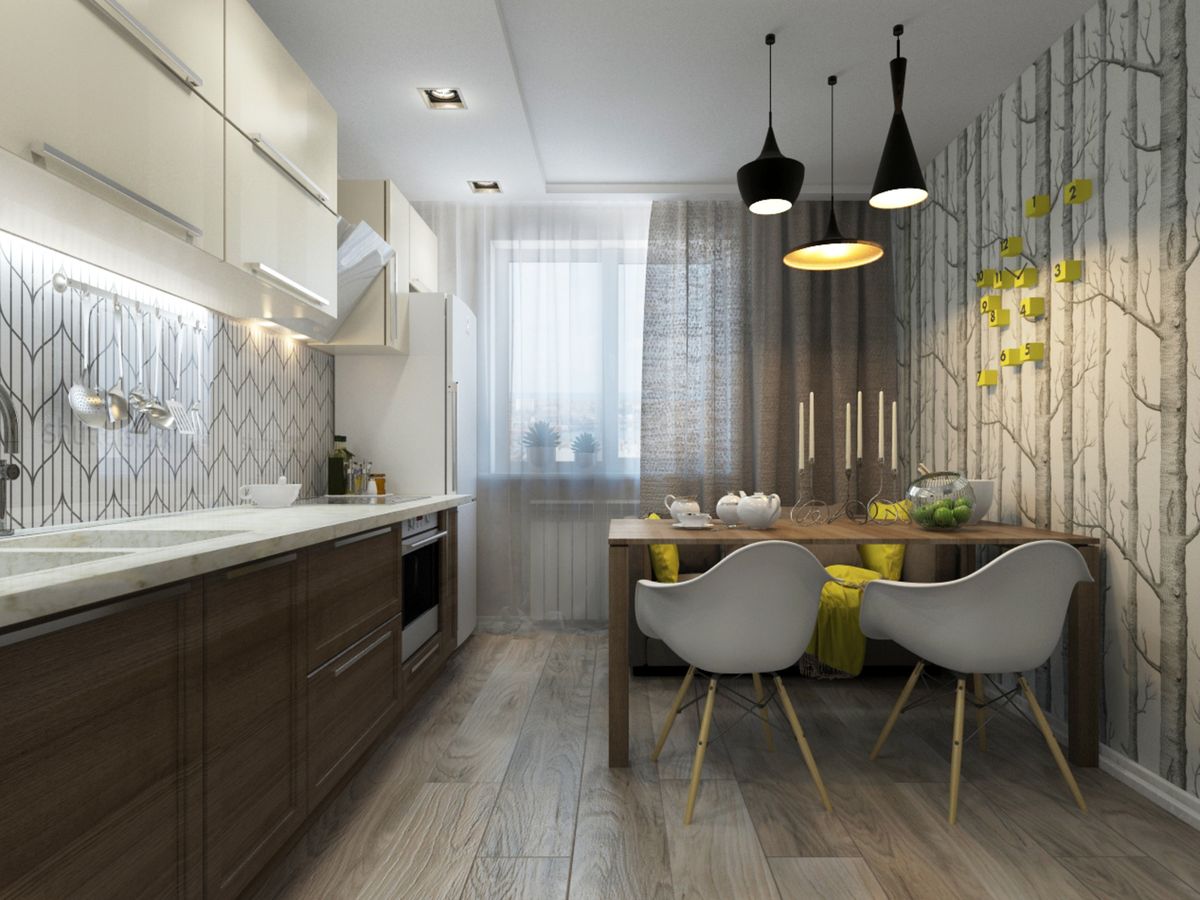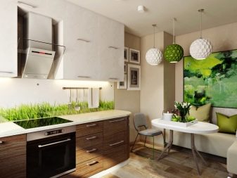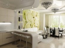 Si la cuisine a de grandes dimensions, elle peut également être combinée avec le salon. Par exemple, un canapé et une table à manger auraient fière allure devant la zone de cuisson. De plus, vous pouvez mettre en évidence la zone à l'aide d'un papier peint photo moderne, qui sera réalisé dans le thème approprié.
