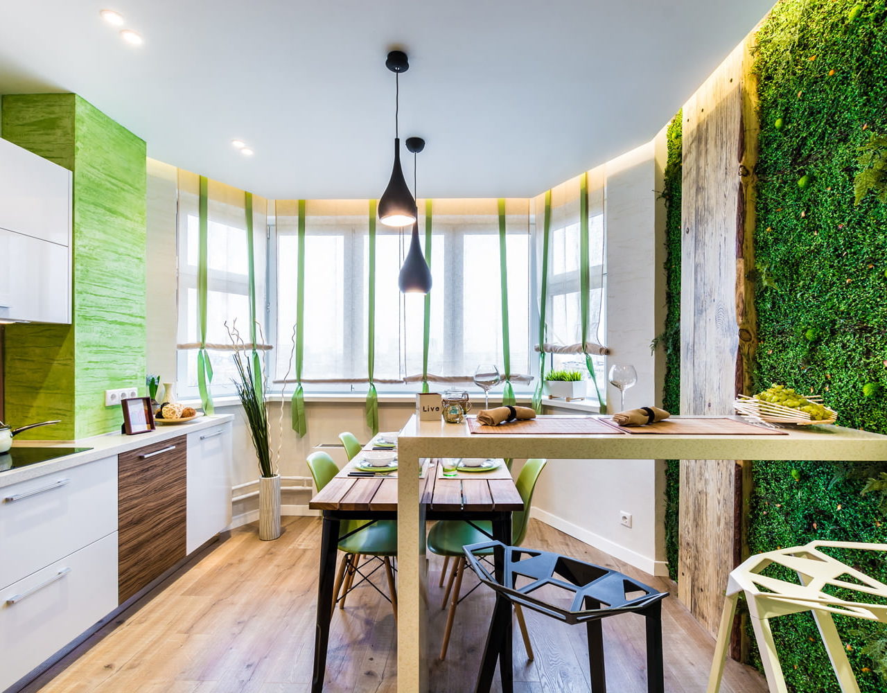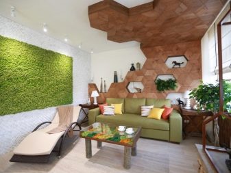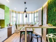 Lors de la décoration de l'intérieur d'un appartement de deux pièces dans ce style, il sera nécessaire d'utiliser une grande quantité de matériaux naturels. Les plus populaires sont le bambou et le bois, qui ont l'air extrêmement intéressants et élégants. Le seul inconvénient de ces produits est qu'ils se distinguent par un coût assez élevé, compte tenu du coût des matériaux et du travail. Une cuisine décorée dans un style écologique comprend souvent des photos murales avec diverses plantes qui vous donnent l'impression d'être dans la nature.