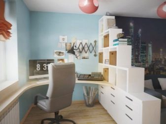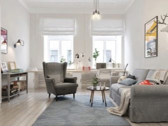 C'est pourquoi la solution optimale est de combiner le salon et la chambre des parents. Dans ce cas, le lieu de couchage peut être caché derrière une cloison spéciale et des supports de meubles spéciaux peuvent également être utilisés à ces fins. Si les dimensions du salon le permettent, vous pouvez aménager ici un petit lieu de travail. Dans la plupart des cas, les concepteurs utilisent pour cela un rebord de fenêtre, qui est remplacé par un comptoir en bois. S'il n'y a pas de balcon, il sera très pratique de travailler dans de telles conditions, car une personne recevra la quantité de lumière naturelle requise.