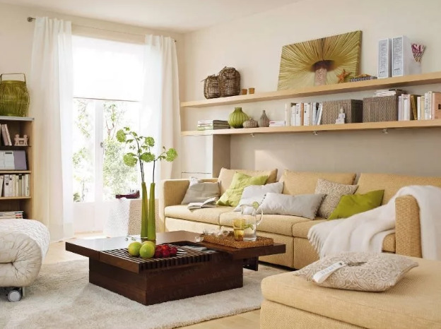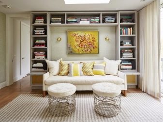 - Mur. L'espace au-dessus du canapé reste généralement vide, bien que diverses étagères et étagères aient l'air parfaites ici. Il convient de garder à l'esprit qu'ils doivent respecter pleinement le design intérieur, non seulement dans leur forme, mais également dans la palette de couleurs.