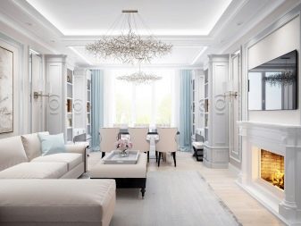 Une caractéristique distinctive de cette tendance stylistique est la présence de formes géométriques claires et de symétrie.Un grand nombre de schémas de couleurs ne peut pas être utilisé ici, et le décor doit être aussi expressif que possible. La pièce maîtresse de l'intérieur de style classique est un grand lustre et des rideaux. Dans une certaine mesure, ces locaux rappellent un domaine anglais.