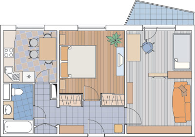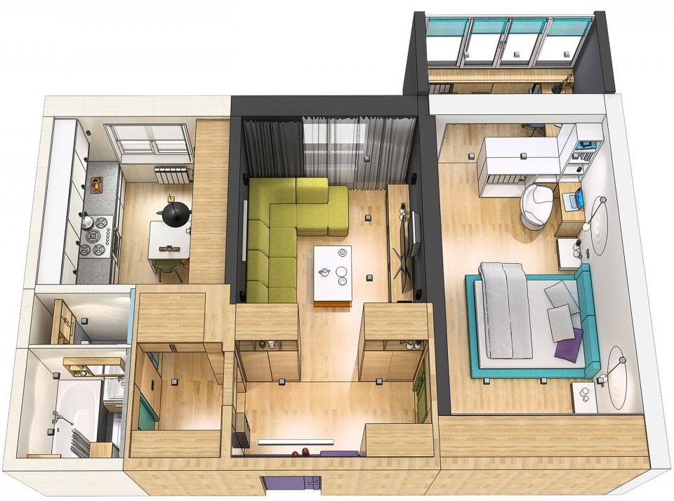 Un deux pièces ne peut pas se vanter d'avoir assez d'espace libre pour lui permettre de créer plusieurs zones ici. C'est pourquoi il est nécessaire de réaliser un zonage de qualité et réfléchi afin de mettre en évidence des zones séparées pour diverses activités. La division de la pièce en secteurs fonctionnels créera, par exemple, une zone isolée pour les enfants dans laquelle les enfants peuvent jouer et ne pas interférer avec les adultes qui font leur propre truc. Bien sûr, il est préférable que les enfants aient un espace séparé, car ils ont leur propre régime spécial et leur propre routine quotidienne, et ils ont également besoin d'un espace isolé pour bien dormir et jouer sans interférence.