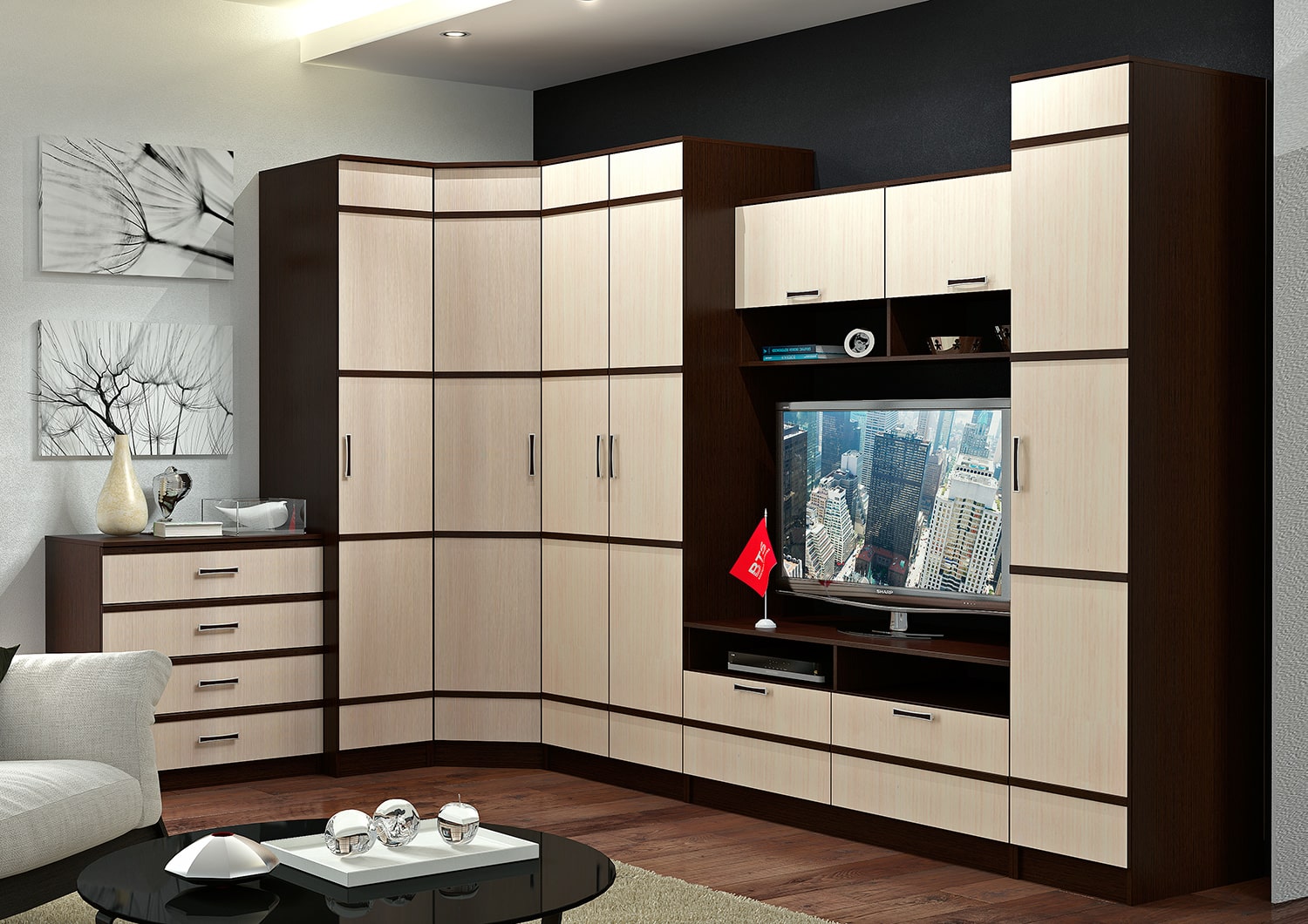 Si l'appartement ne peut pas se vanter d'un espace libre suffisant, le mobilier sectionnel ou modulaire sera la solution idéale. C'est beaucoup moins cher que les meubles sur mesure, mais il peut aussi parfaitement s'intégrer même dans les plus petites pièces. Les modules du système se distinguent par le fait qu'ils peuvent être sélectionnés en fonction des caractéristiques de la pièce, grâce à quoi un mur de la pièce peut être complètement rempli et l'autre libre, ce qui augmentera visuellement l'espace et offrira un haut niveau de confort .