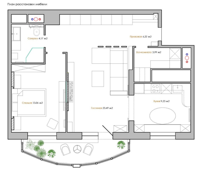 Si l'appartement dispose d'un balcon, il doit également faire l'objet d'une attention particulière. Si les capacités techniques le permettent, il peut être combiné avec une pièce. Si l'aménagement est agencé de telle sorte que l'unification est impossible, alors il serait logique de créer un excellent espace de détente sur le balcon en installant un petit canapé. Si vous y placez une table, la pièce se transformera en un excellent espace de travail.