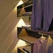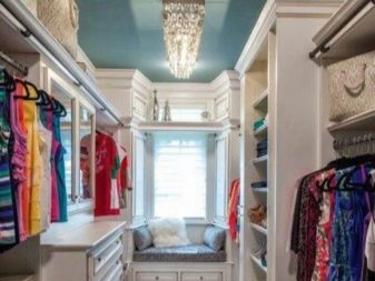 Même la pièce la plus petite et la plus étroite peut être rendue confortable et multifonctionnelle, si vous prenez soin du bon éclairage. Ainsi, pour les petits dressings, les experts recommandent d'utiliser un éclairage ponctuel au plafond sous forme de lampes intégrées au plafond tendu. De plus, les lampes elles-mêmes peuvent être choisies très belles, elles peuvent devenir un excellent élément de décoration.