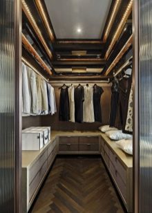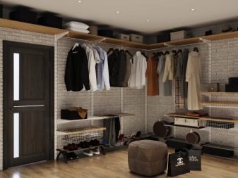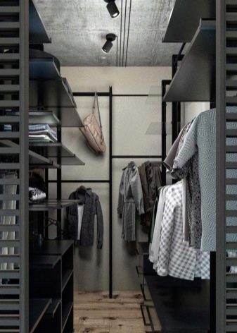 - Techno. Vous pouvez créer un dressing multifonctionnel et à la mode dans ce style. Il est assez chaleureux et confortable, le plus souvent il est choisi pour aménager des appartements pour les jeunes et les hommes célibataires, car les matériaux bruts, ainsi que les surfaces en métal et en verre, peuvent prévaloir dans ce style.