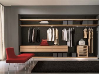 Dans les magasins de meubles, vous pouvez trouver des systèmes prêts à l'emploi, ainsi que des options que les fabricants produisent sur commande selon des mesures individuelles. De tels systèmes sont simplement installés dans la pièce requise. Leur caractéristique est qu'ils n'ont pas de parois latérales et de dos, mais il n'y a qu'un cadre principal, composé de tiroirs, d'étagères, de tringles et bien plus encore. Le remplissage peut être très diversifié.