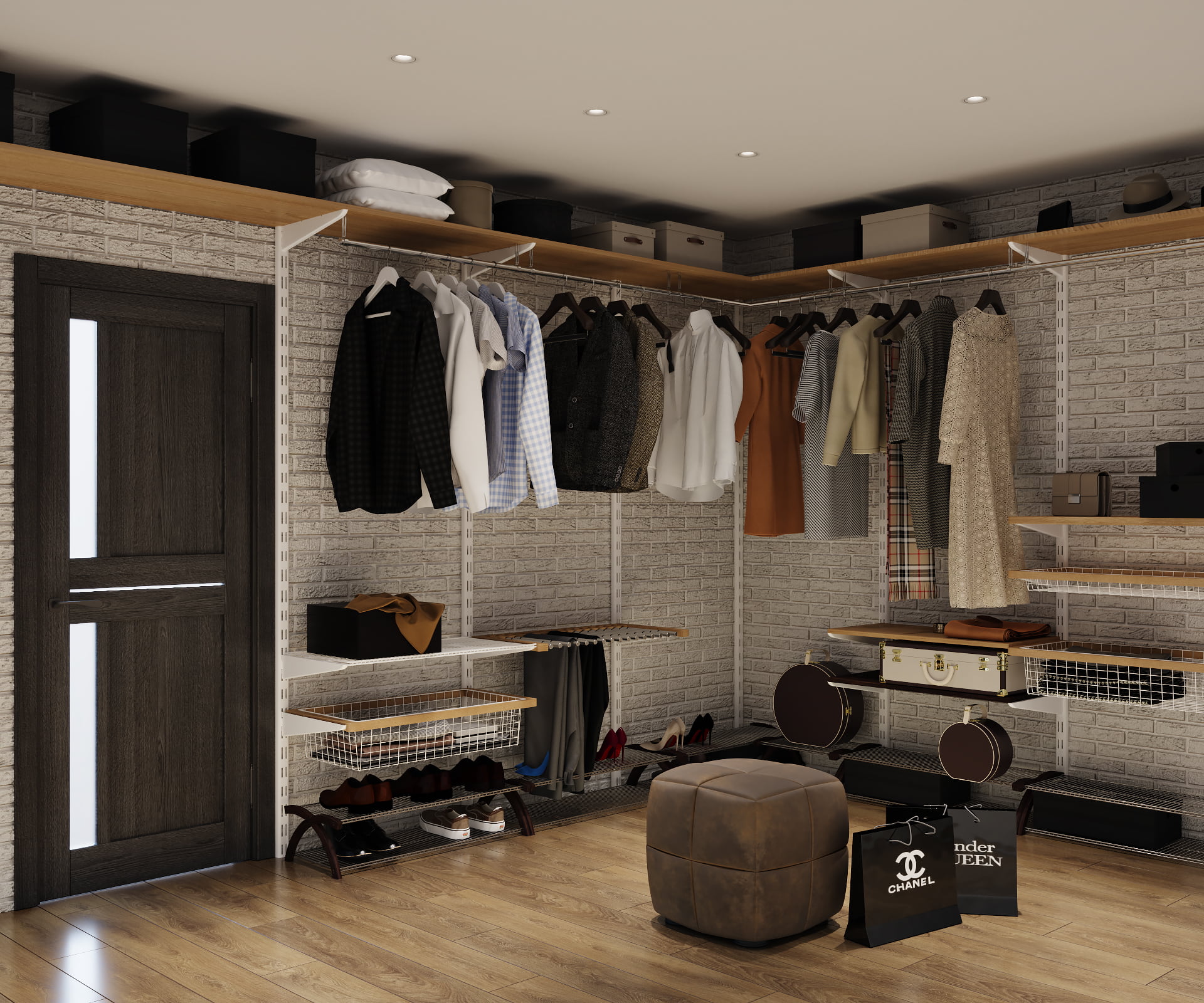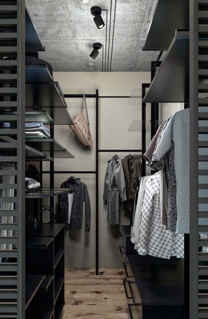 - Grenier. Un dressing de style loft suppose soit des murs bruts, soit une finition en béton ou en brique.Le loft est choisi par les créatifs et les jeunes qui placent un minimum d'armoires fermées dans leurs dressings, préférant des cintres multifonctionnels.