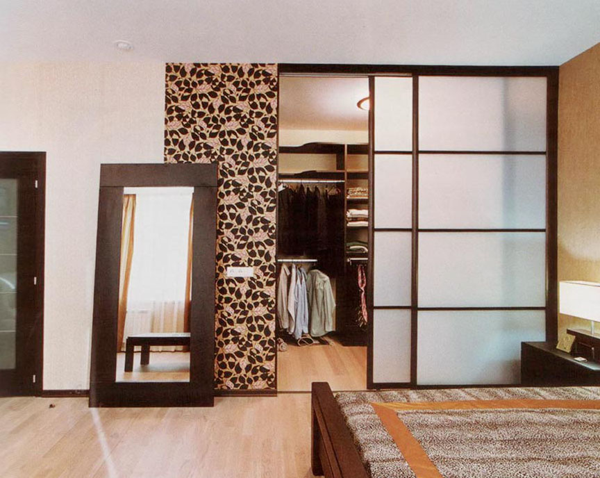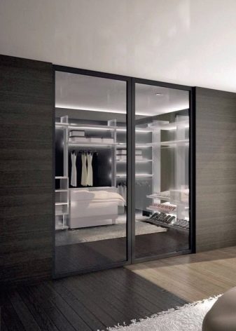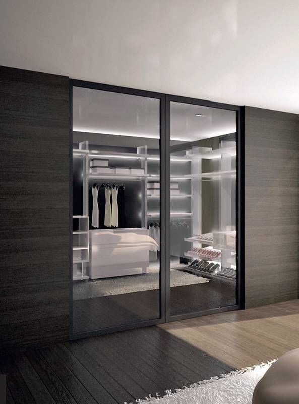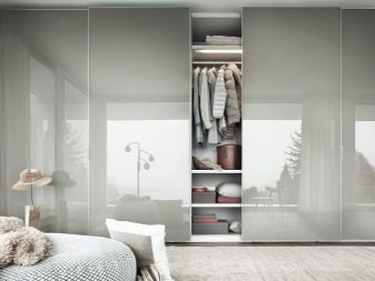 Le choix de la porte du dressing dépendra principalement de la superficie de la pièce. Dans une pièce grise, petite et étroite, il est clair que des structures légères sont nécessaires. Dans ce cas, vous pouvez choisir une structure de porte vitrée (translucide ou mate).