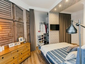 Il n'est pas toujours approprié d'installer une porte au dressing, par exemple, où il y a peu d'espace, mais vous souhaitez séparer les pièces, vous pouvez accrocher des rideaux à la place de la porte. Pour de tels cas, des textiles translucides légers sont sélectionnés - une solution idéale pour une chambre à coucher pour clôturer un coin ouvert pour ranger la literie ou les vêtements.