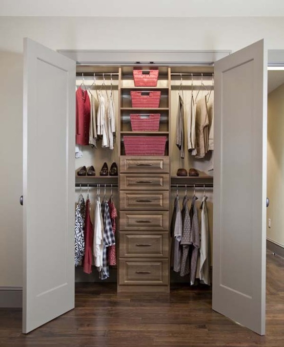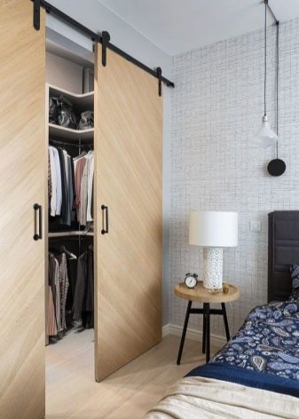 Une façon originale de compléter l'aménagement d'une pièce penderie dans un appartement ou l'aménagement d'une penderie dans un chalet en dehors de la ville. En raison des caractéristiques de conception (présence de rouleaux, chariots, guides), les portes des étuis à crayons ressemblent à des portes de compartiment, ne différant que par la toile.