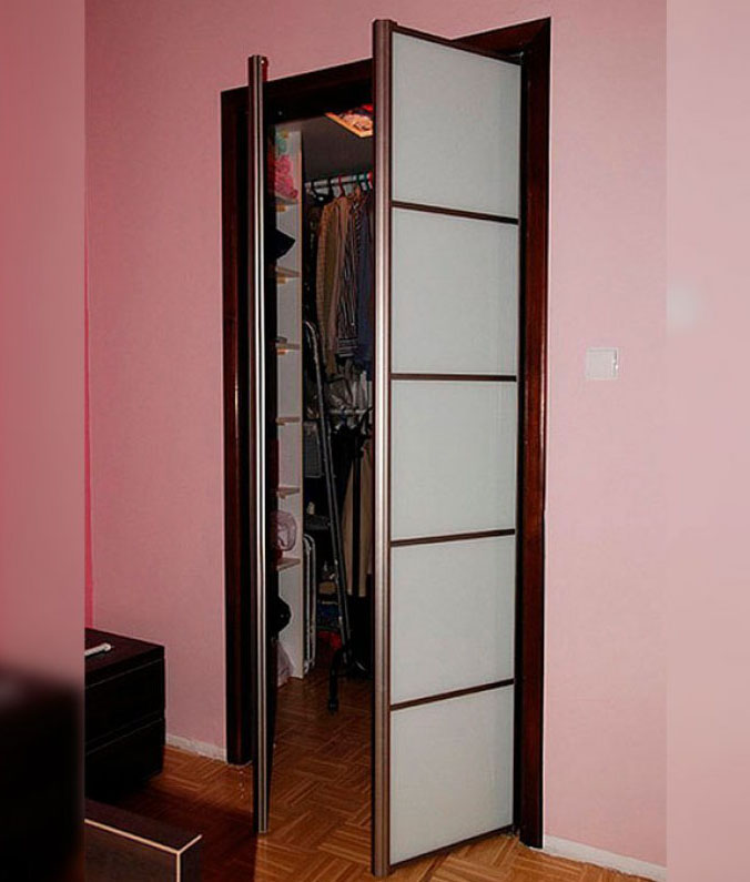 Base très fiable, crée du confort, ne nécessite pas beaucoup d'espace pour l'installation et le fonctionnement. Chaque vantail d'une telle porte est encastré dans le mur, laissant un libre passage au dressing. La « trousse à crayons » est une solution idéale pour un petit format, où chaque centimètre vaut son pesant d'or.