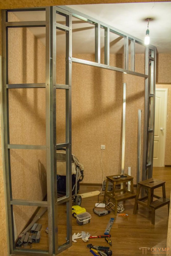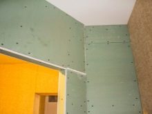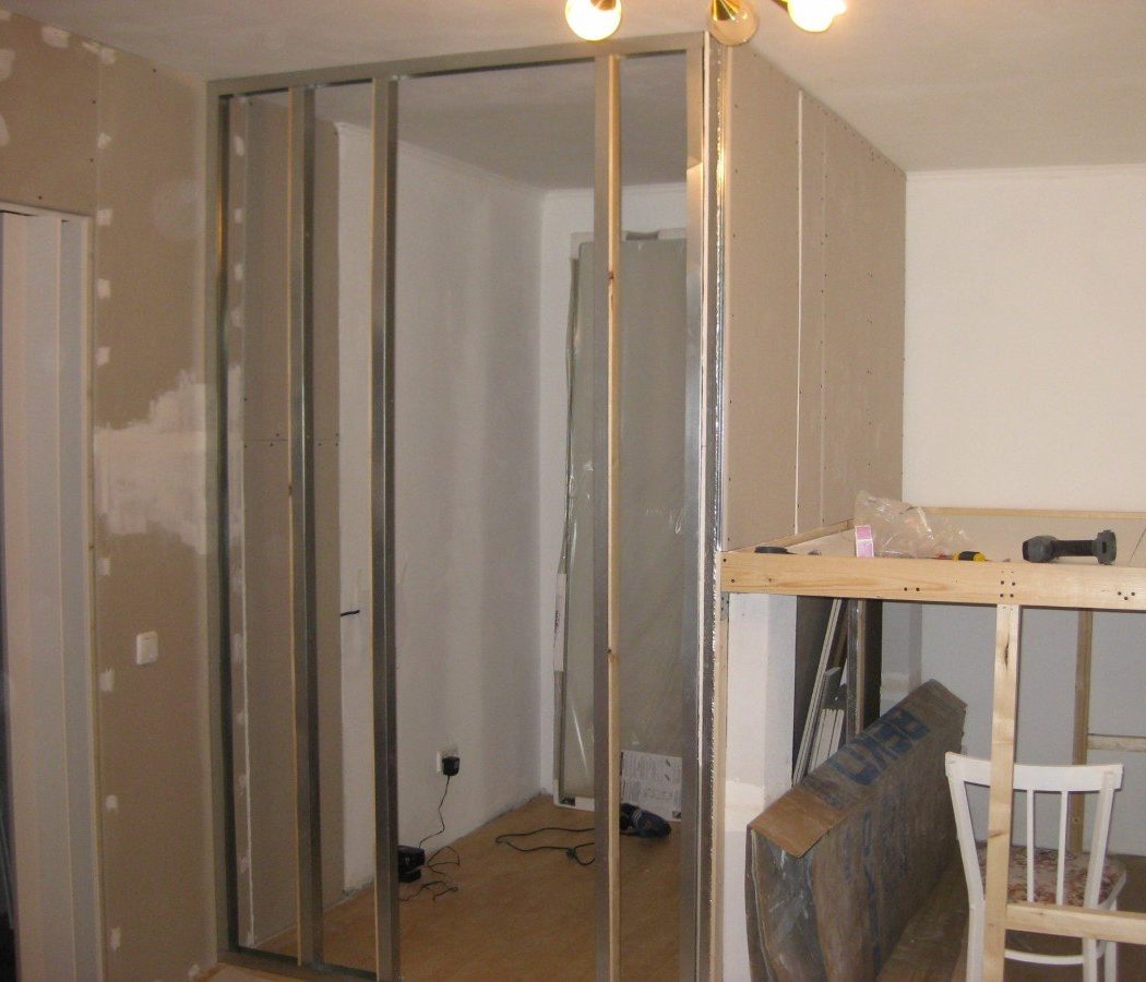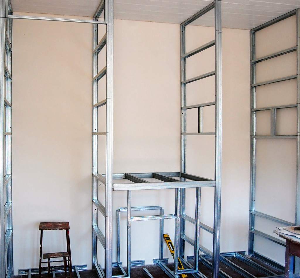 Ensuite, nous fixons des profilés verticaux dans des rainures spéciales avec un pas de 50-60 cm. Cela doit être fait de manière fiable et ferme. Dans ce cas, les structures d'angle doivent être renforcées, par exemple avec de petites barres. Aux endroits où sont installés des portes, des étagères et des étagères, nous réalisons également des renforts avec des cavaliers. Ensuite, les plaques de plâtre nécessaires sont coupées et fixées au profilé à l'aide de vis autotaraudeuses. Aux endroits des coutures, des vis autotaraudeuses sont installées en damier.