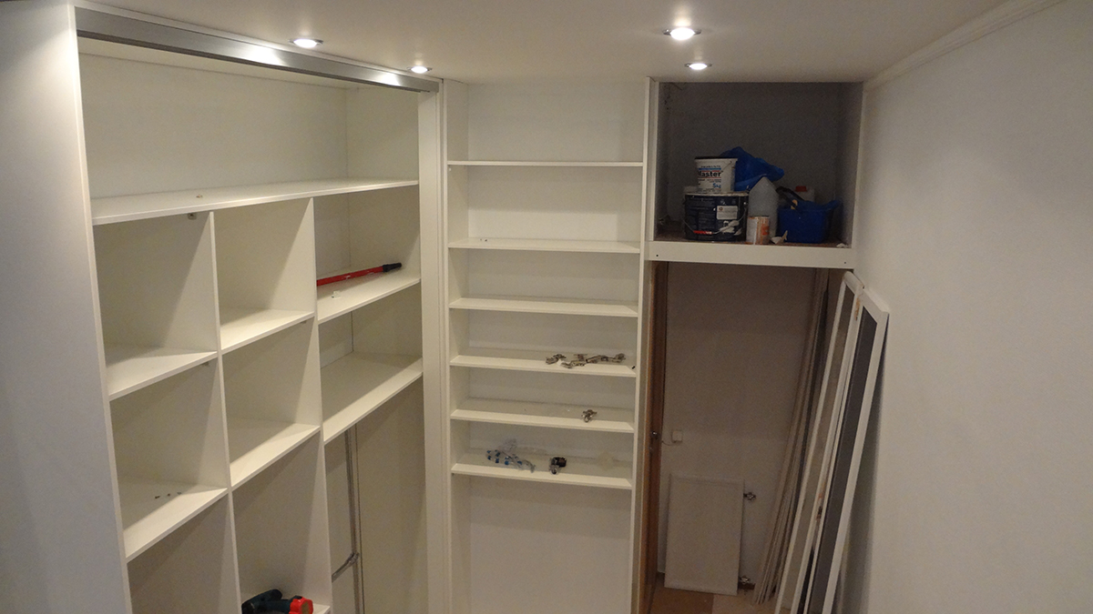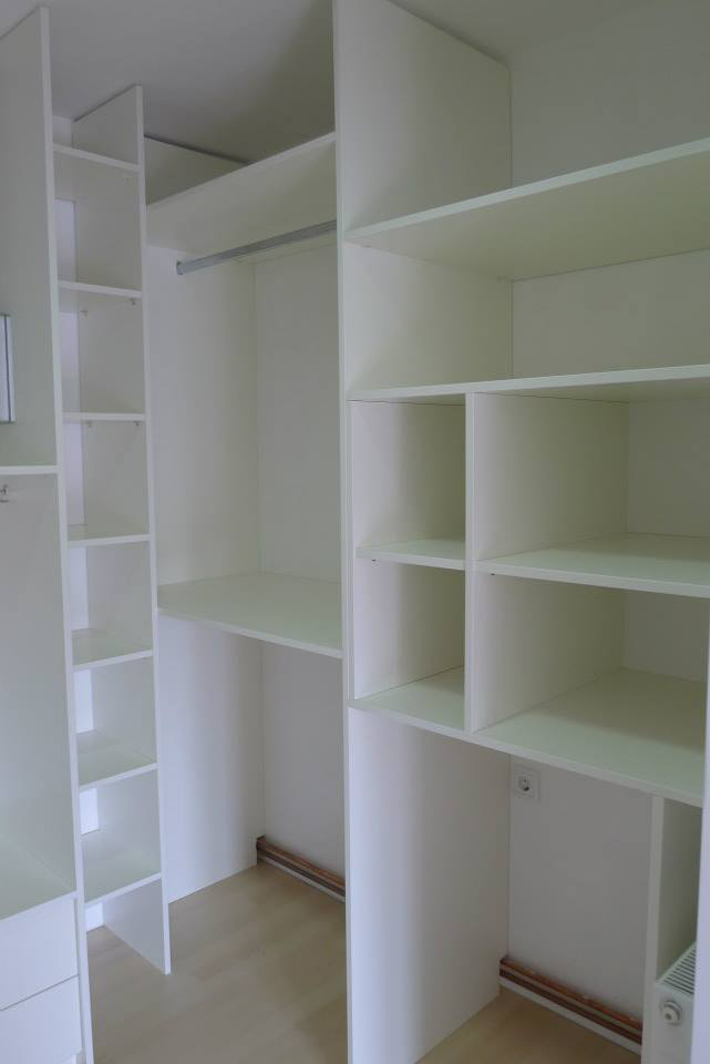 Certains modules standards sont utilisés pour équiper le dressing, à savoir : les barreaux pour les cintres, les parties inférieures, c'est-à-dire les tiroirs avec étagères, et les parties supérieures pour les accessoires, les petites choses et les chapeaux. Et aussi la literie et d'autres choses sont stockées dans le dressing.