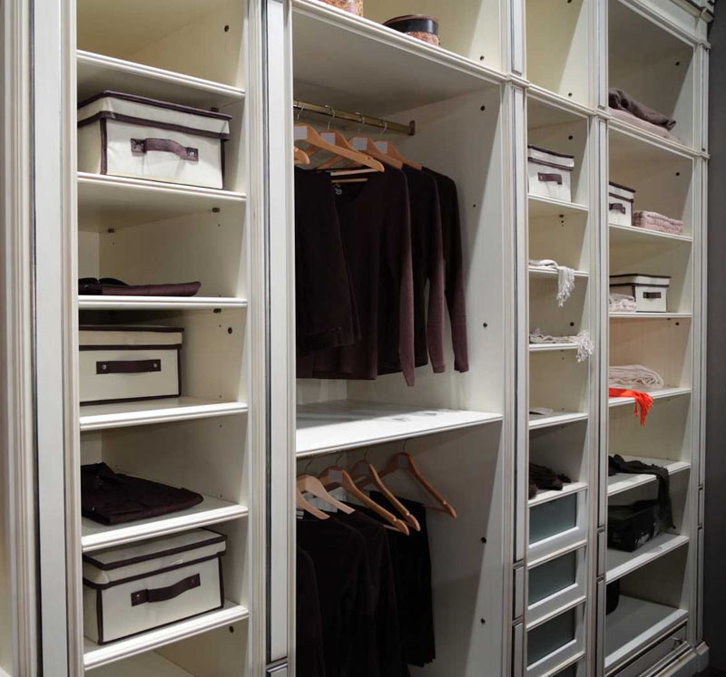 En règle générale, les sections inférieures du vestiaire sont remplies et utilisées pour ranger les chaussures, les sections supérieures pour les accessoires et les chapeaux et les barres transversales pour ranger les articles froissés et longs tels que les chemises ou les pantalons.