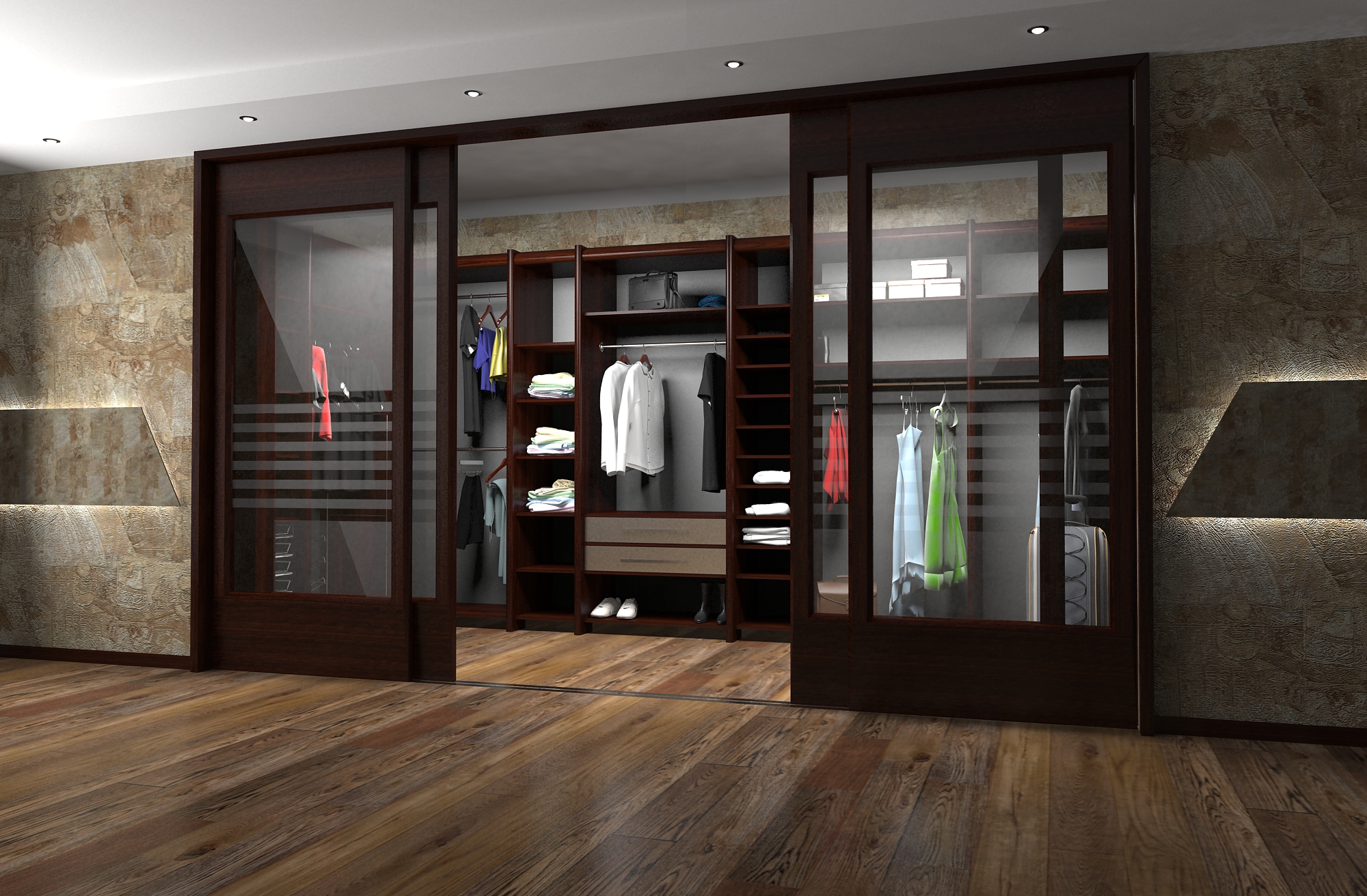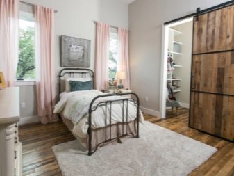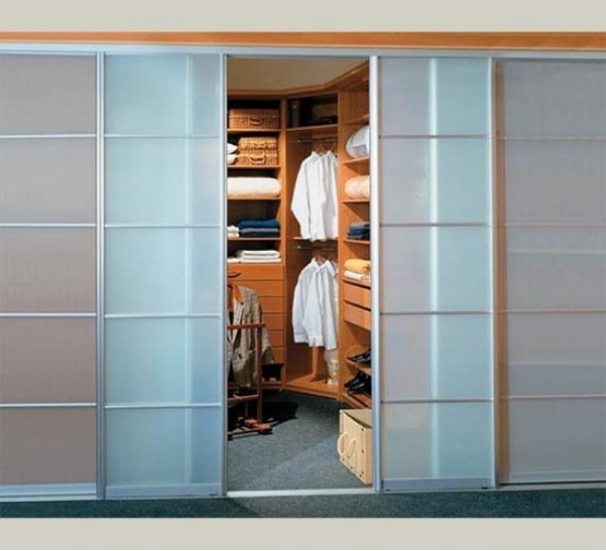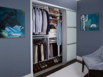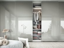 Si l'armoire est située dans la chambre, il est important de prendre en compte, outre l'attractivité, l'aspect pratique. Cela aidera les portes coulissantes telles que les stores ou les tissus sur la corniche du plafond. Vous pouvez également choisir des modèles entièrement transparents ou en miroir. Il est souhaitable que leur couleur coïncide avec l'une de celles déjà présentes à l'intérieur.