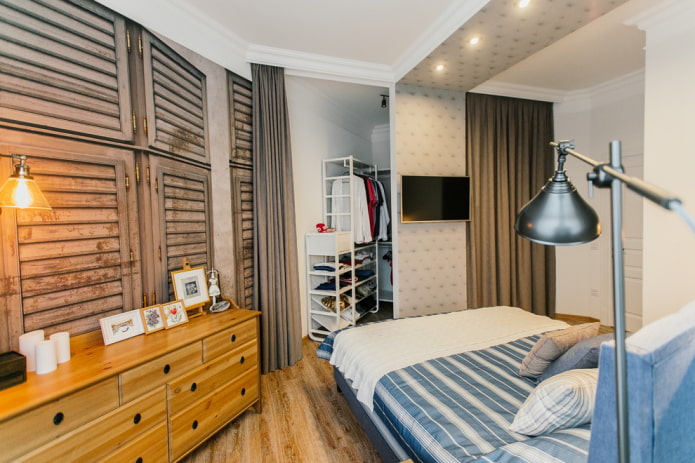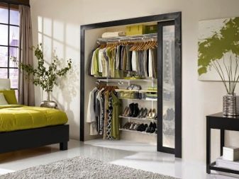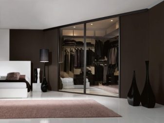 Pour le dressing, sous lequel le coin de la pièce est réservé, des modèles de miroirs de type coupé conviennent. Les niches peu profondes dans le mur doivent être complétées par des toiles à lattes. De ce fait, l'air circulera librement, ce qui aura un effet positif sur la qualité du stockage.