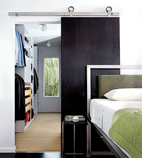 Les portes coulissantes font partie intégrante du mobilier lors de la disposition des cloisons entre les pièces. Cependant, le plus souvent, cette solution peut être vue dans les vestiaires. La conception polyvalente permet d'économiser beaucoup d'espace tout en séparant magnifiquement la frontière entre la pièce et l'endroit où les choses sont stockées.
