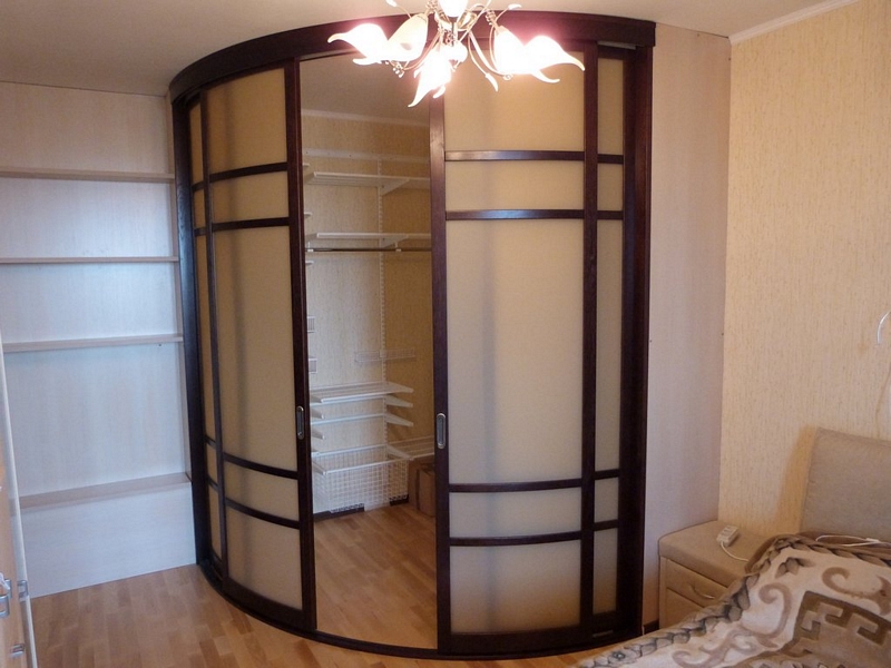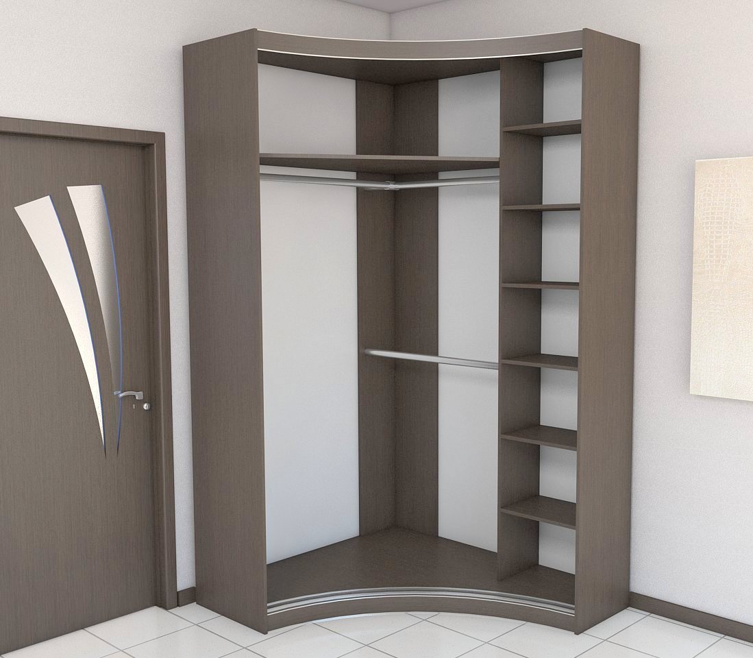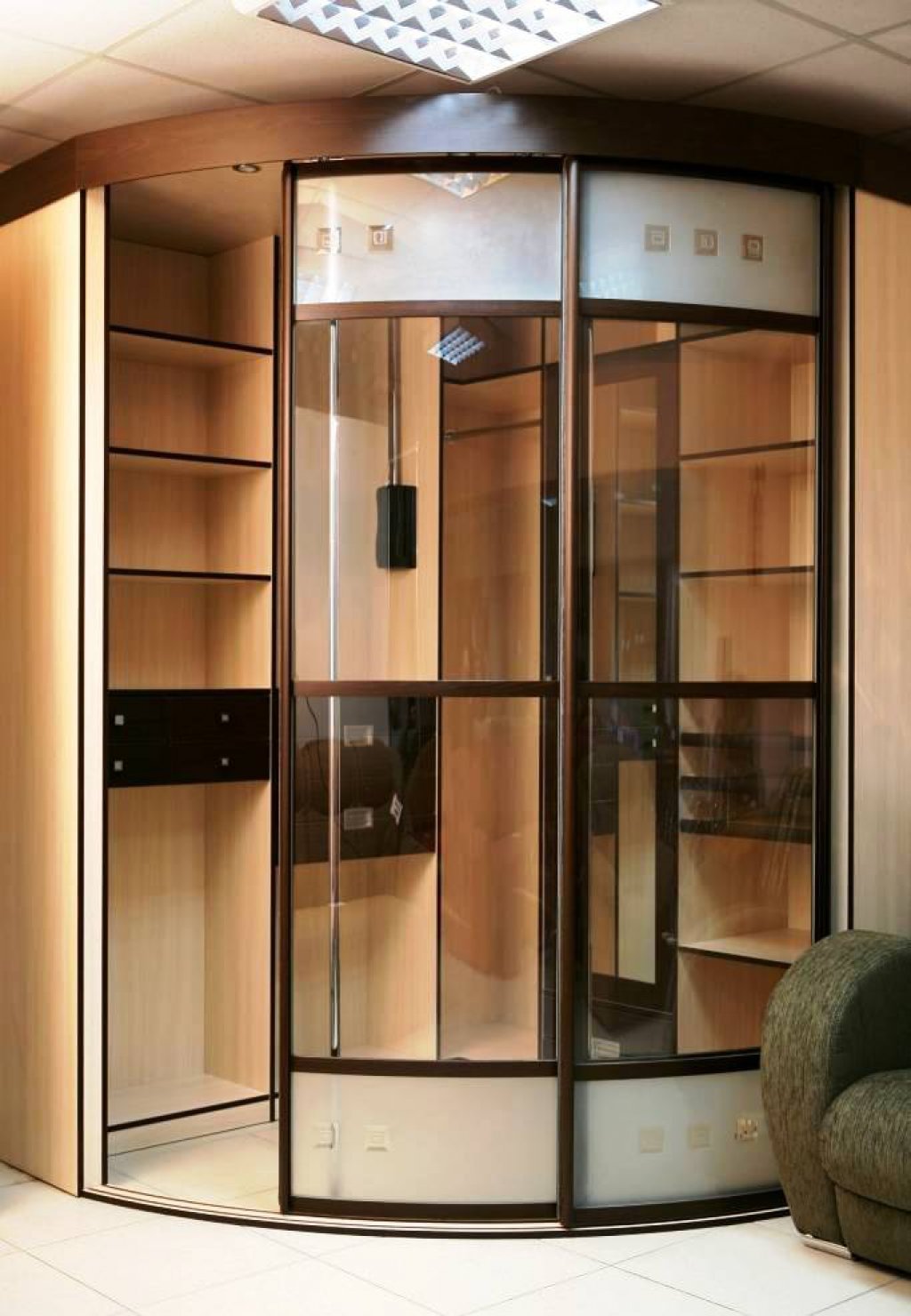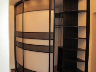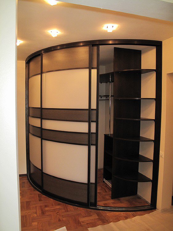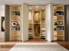 L'armoire d'angle peut avoir une structure ronde ou semi-circulaire. De tels types de structures sont choisis afin d'économiser autant que possible les mètres carrés inoccupés dans la pièce. Mais les options rondes ont un inconvénient sérieux, qui est la pénibilité de leur conception et de leur installation. En pratique, le prix de tous les éléments constitutifs de l'ouvrage considéré s'avère beaucoup plus élevé que dans les autres cas.