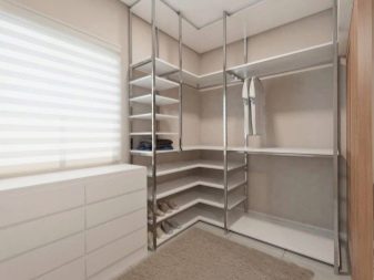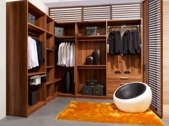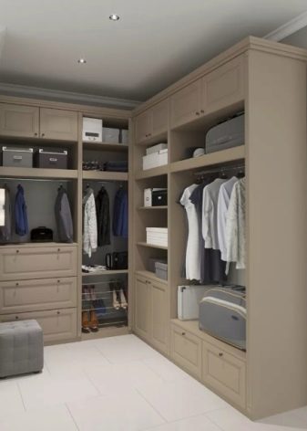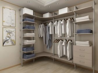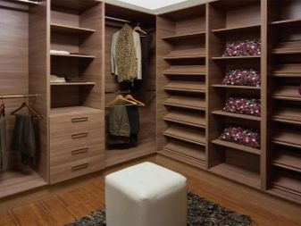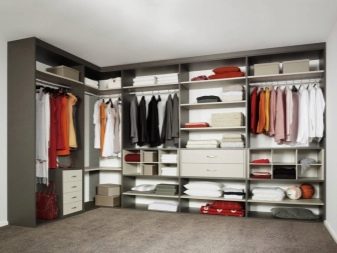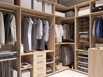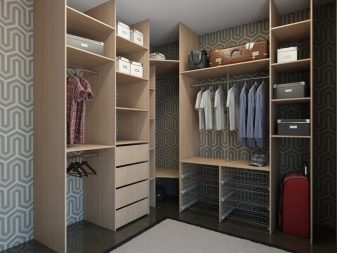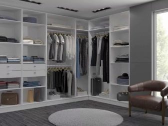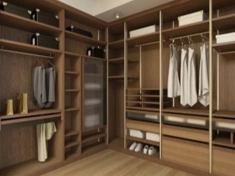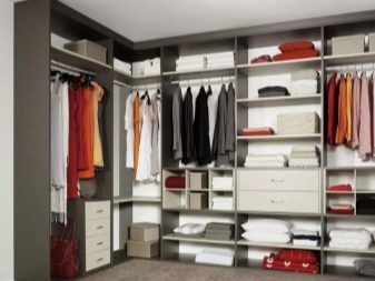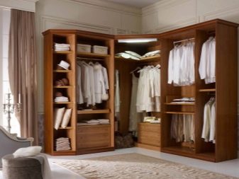Cette forme de dressing est plus familière et plus répandue. Les structures en forme de L sont placées simultanément sur plusieurs murs d'angle. Ces armoires se caractérisent par leur grande fonctionnalité et leur espace. Dans la partie intérieure de cette option, les armoires ou les racks sont placés le long d'une ligne le long des murs et leur connexion se produit dans le coin. Les vêtements peuvent être rangés ici à la fois sur des étagères et sur des barres, des crochets, grâce auxquels il est possible de trier efficacement différentes choses.