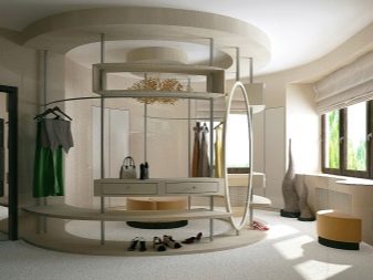 Les options semi-circulaires sont particulièrement attrayantes et harmonieuses dans le salon ou dans le hall. Il est préférable d'installer ici une structure avec des portes coulissantes sur des guides à rouleaux spéciaux. De tels dressings peuvent parfaitement s'intégrer dans de nombreux intérieurs. Ils sont très faciles à utiliser.