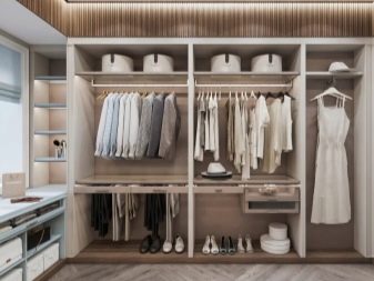 Il ne faut pas « mélanger » les garde-robes masculines et féminines. Il est conseillé de diviser qualitativement l'espace disponible en zones distinctes. Si un enfant vit dans la famille, vous devrez également lui allouer au moins une petite place au cas où il n'y aurait pas d'autres zones pour l'emplacement de ses affaires. Pour équiper un "coin des enfants" dans le dressing, il est logique de recourir à l'installation d'un bar avec un paramètre de hauteur réglable.