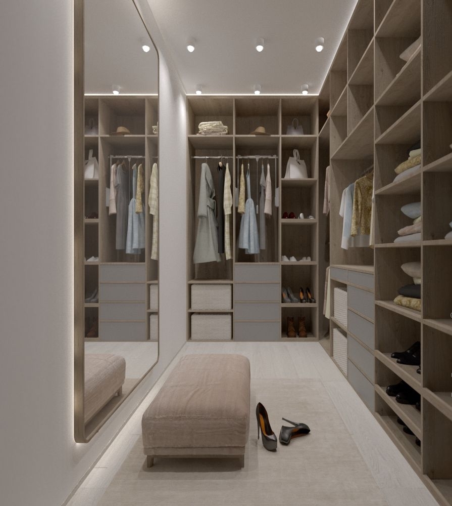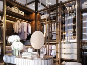 Vous ne pouvez installer une table ou un pouf que dans un dressing de grande taille, car le fonctionnement des petits espaces avec ces composants sera moins confortable. Si, après avoir organisé toutes les choses prévues, il y a encore de l'espace libre dans le dressing, il sera alors possible de placer en plus une planche à repasser et un fer à repasser ici. Ce sera très pratique s'il y a une prise dans l'un des murs voisins.