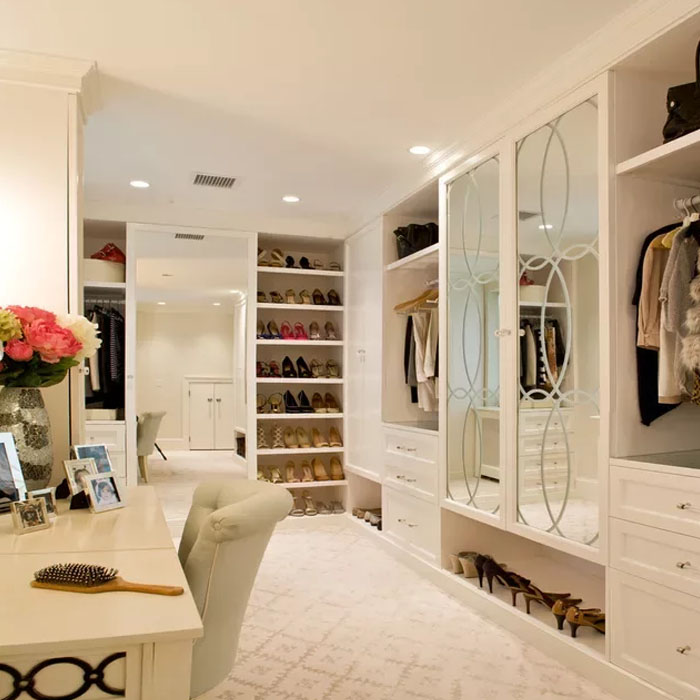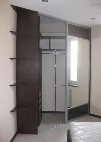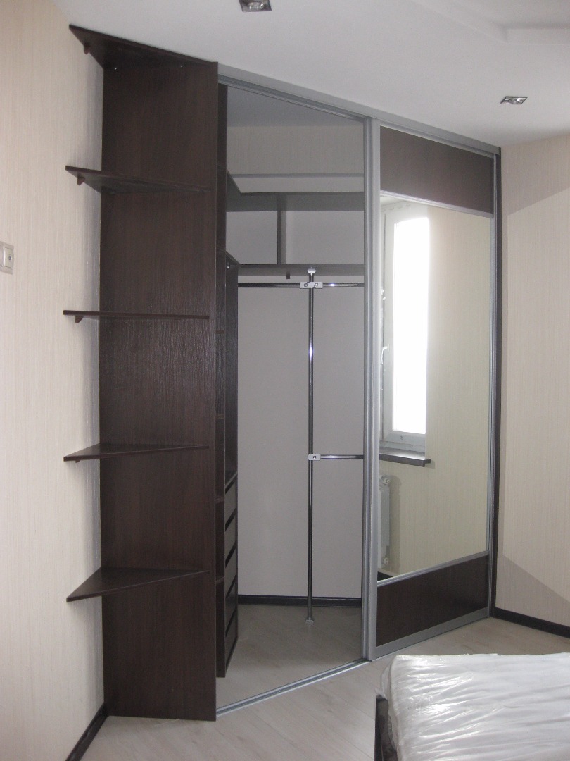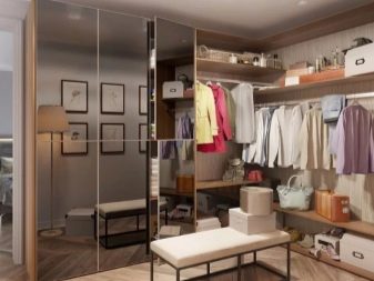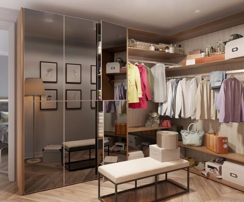 Le principal inconvénient du dressing en L est qu'il y a peu d'espace pour la cabine d'essayage. Fixer le support avec un grand miroir à l'intérieur sera impossible. Vous pouvez sortir de la situation par les portes en miroir de l'armoire.