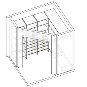 Le compartiment, qui sera destiné aux vêtements d'extérieur, doit être le plus près possible de l'entrée du vestiaire. Afin de pouvoir placer le plus de paires de chaussures possible dans la structure, il est conseillé de réaliser les étagères uniquement horizontales, sans faire d'inclinaisons.