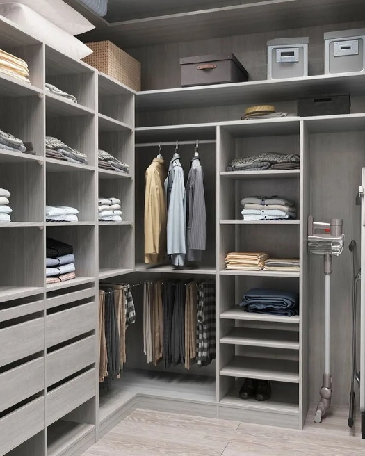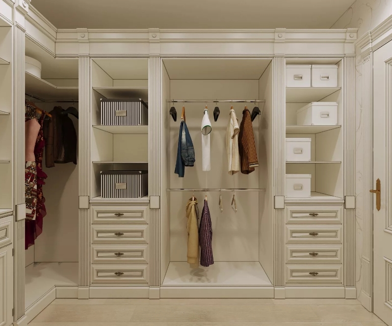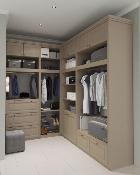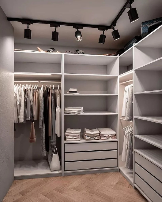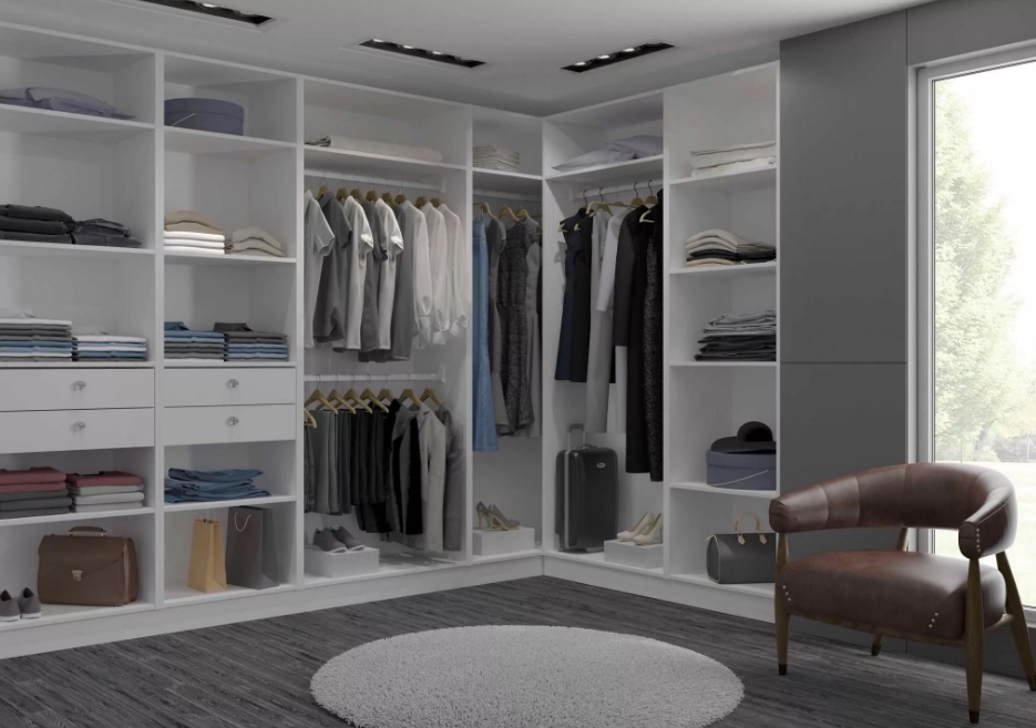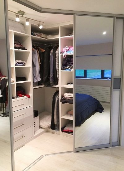 Il y a suffisamment d'espace dans le dressing en forme de L pour que vous puissiez facilement placer toutes sortes de systèmes de rangement qui diffèrent les uns des autres en termes de fonctionnalité. Souvent, les portes pour le design en question sont sélectionnées comme compartiment, mais des pièces pivotantes standard conviennent également. Les deuxièmes types de portes occupent plus d'espace libre lorsqu'elles sont ouvertes. Pour gagner de la place, il vaut mieux privilégier les dressings en L équipés de portes à compartiments.