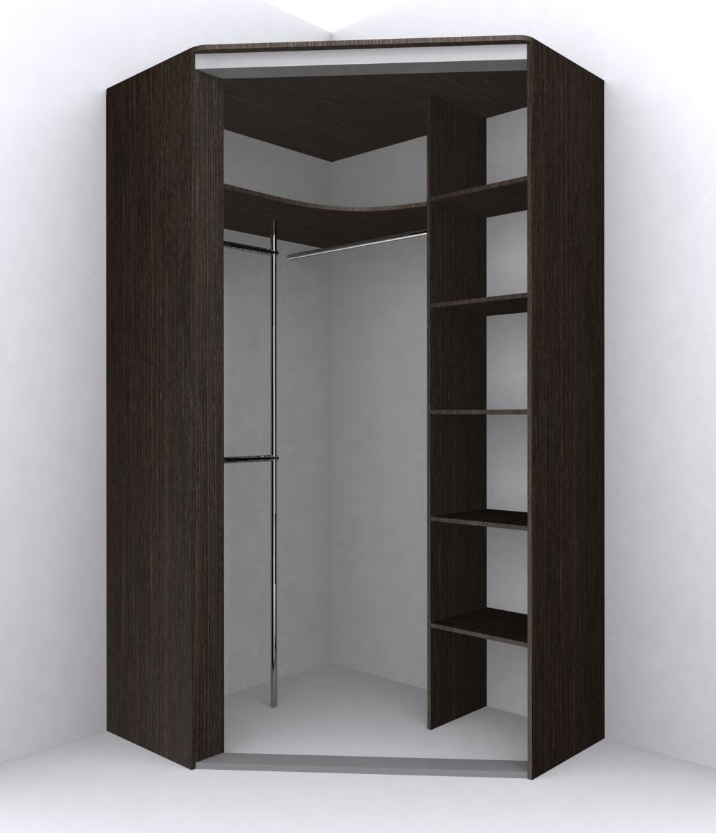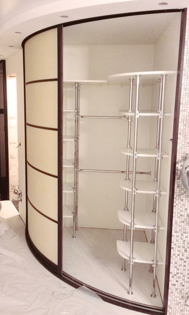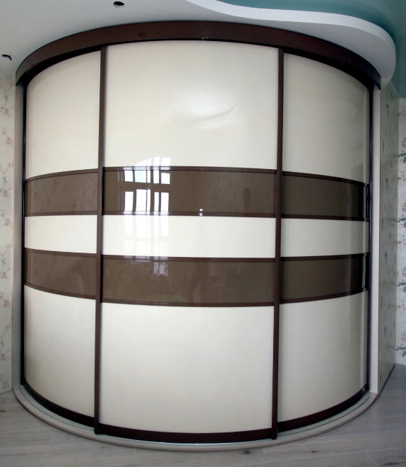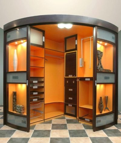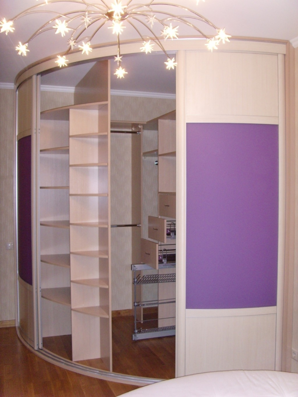 Les portes du dressing triangulaire peuvent être semi-circulaires. De ce fait, vous pouvez obtenir un espace et un espace plus impressionnants.Pour cela, des portes de compartiment à rayon de haute qualité sont exposées, qui se déplacent le long de guides de type rond.