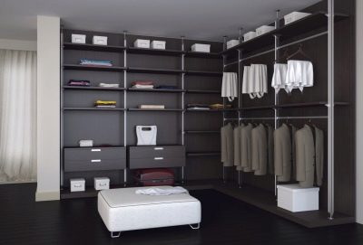 - Dans des conditions de grand espace libre, vous pouvez équiper un dressing minimaliste sombreconstitué de structures métalliques équipées d'étagères ouvertes et de tiroirs. Pour qu'une telle solution n'ait pas l'air trop sombre, elle doit être diluée avec des détails blancs et un pouf blanc comme neige doit être placé au centre.