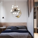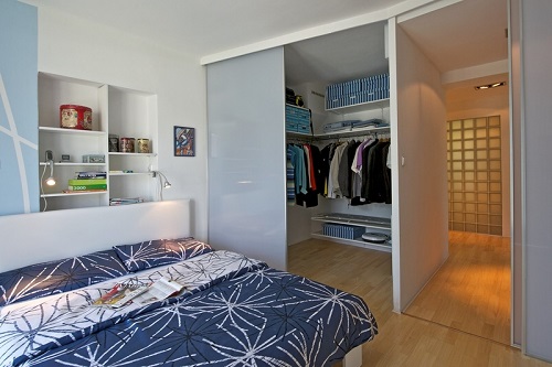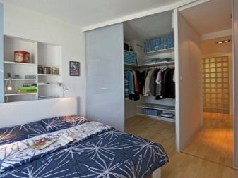 - Une solution de conception populaire est une cloison translucide qui, une fois déplacée, vous permet de combiner l'espace de la chambre avec le système de stockage. C'est un excellent choix pour les intérieurs minimalistes.