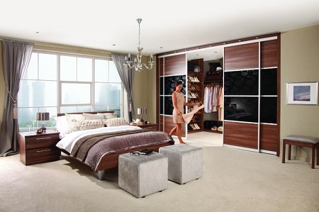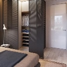 - Le long d'un des murs. C'est la solution parfaite pour les chambres spacieuses de plus de 20 m2. Ici, il est d'usage de séparer le dressing avec des cloisons en plaques de plâtre ou de l'aménager sous la forme d'une armoire. Dans ce cas, une entrée séparée est située là où cela convient au propriétaire, elle peut être clôturée avec un écran ordinaire, une porte en accordéon ou des rideaux souples. Lorsque vous placez le dressing le long du mur, le plus important est l'utilisation rationnelle de la zone.