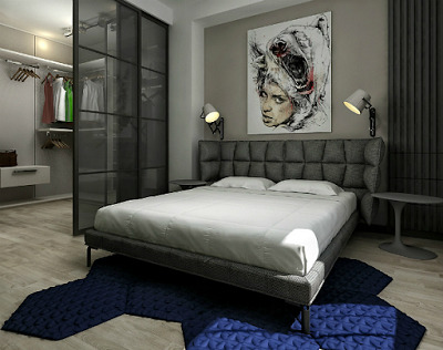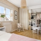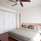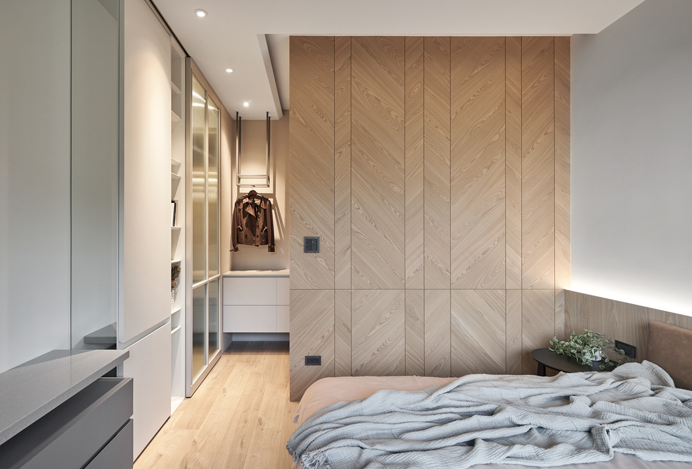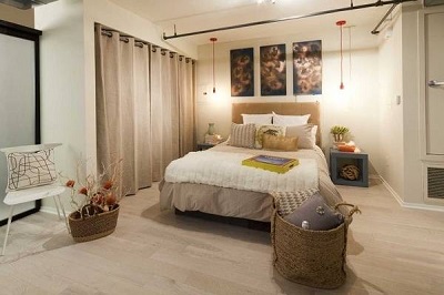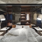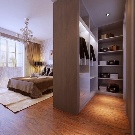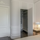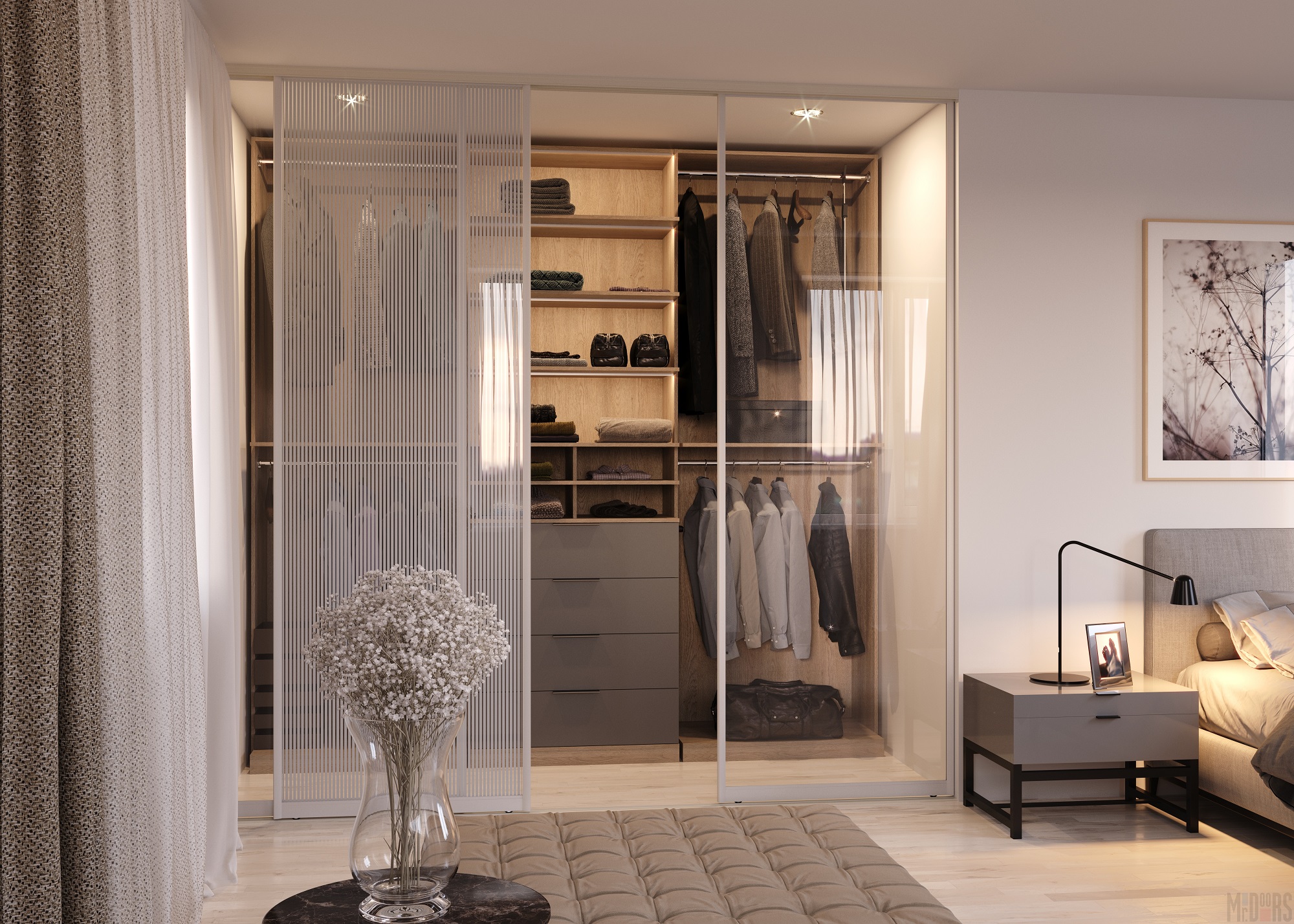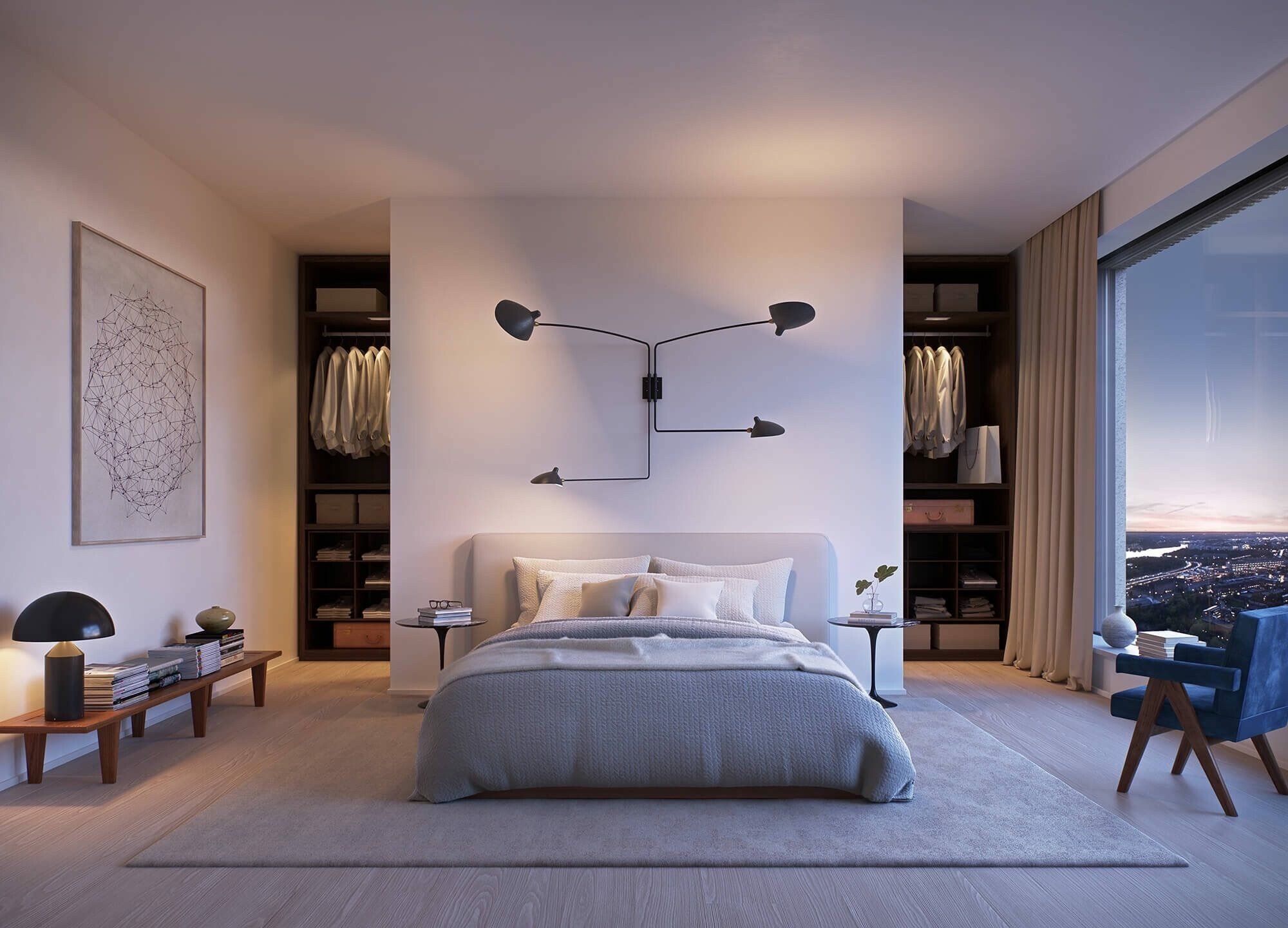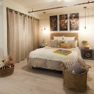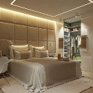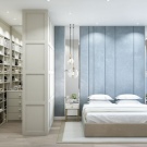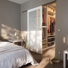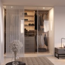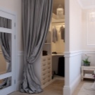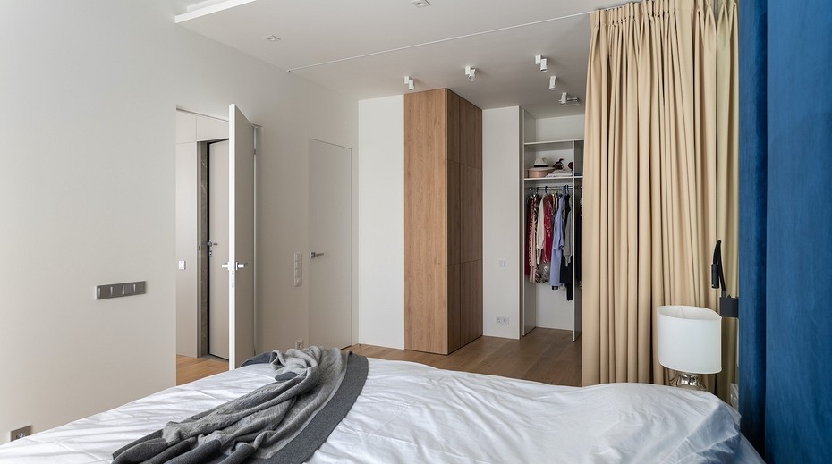 - Dressing ouvert avec rideaux textiles dans la même gamme avec la déco intérieure. Le zonage de la chambre est réalisé par une décoration murale contrastée.