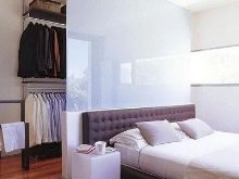 - Derrière la tête du lit. Cette option convient aux pièces de type "étui à crayons", dans lesquelles la longueur est sensiblement supérieure à la largeur. Ici, vous pouvez séparer une partie de la pièce sans fenêtres ni portes avec une cloison avec une entrée latérale et placer un lit à côté. Il est important que la longueur et la largeur d'un bloc de garde-robe séparé ne soient pas inférieures à 1,2 m.Les conceptions plus petites sont appelées armoires intégrées.
