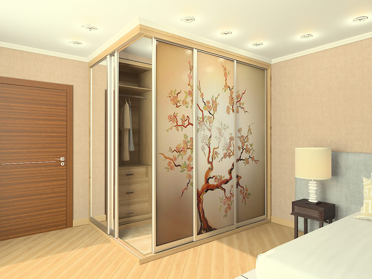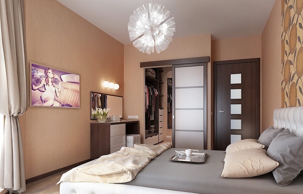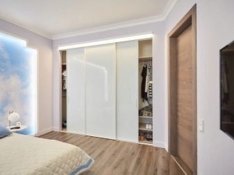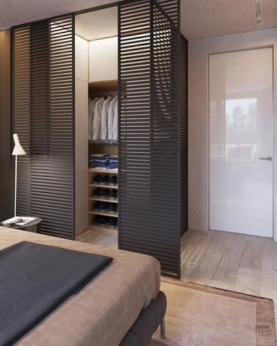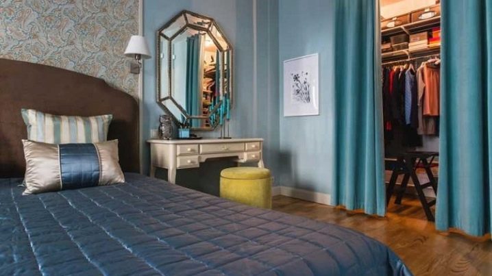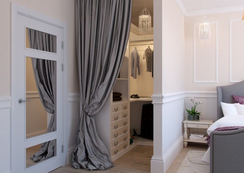 Les petits dressings de la chambre peuvent être garnis de panneaux décoratifs. Les cloisons sont généralement équipées de cloisons sèches, peintes ou enduites à l'extérieur, recouvertes de papier peint. C'est optimal si l'intérieur du dressing a une finition claire. Sa partie extérieure est généralement décorée dans la même gamme et le même style que toute la chambre. Si des textiles sont utilisés à la place des portes, il est préférable de prendre le même que celui utilisé pour décorer les fenêtres.