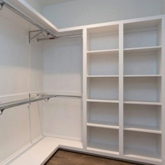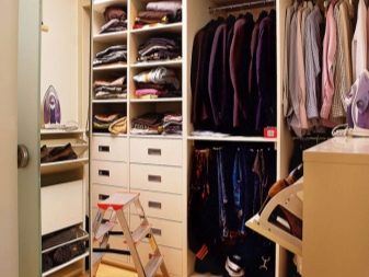 Même dans une petite pièce ou une pièce de passage, vous pouvez organiser une armoire séparée avec tous les éléments nécessaires du système de rangement. Il est seulement important de prendre en compte certaines subtilités. Peu importe si une forme carrée, rectangulaire ou angulaire du dressing est choisie, sa superficie ne doit pas être inférieure à 1,5-2 m2. La largeur de l'entrée d'une pièce séparée est calculée dans la plage de 700 mm, la profondeur des étagères - à partir de 55 cm.
