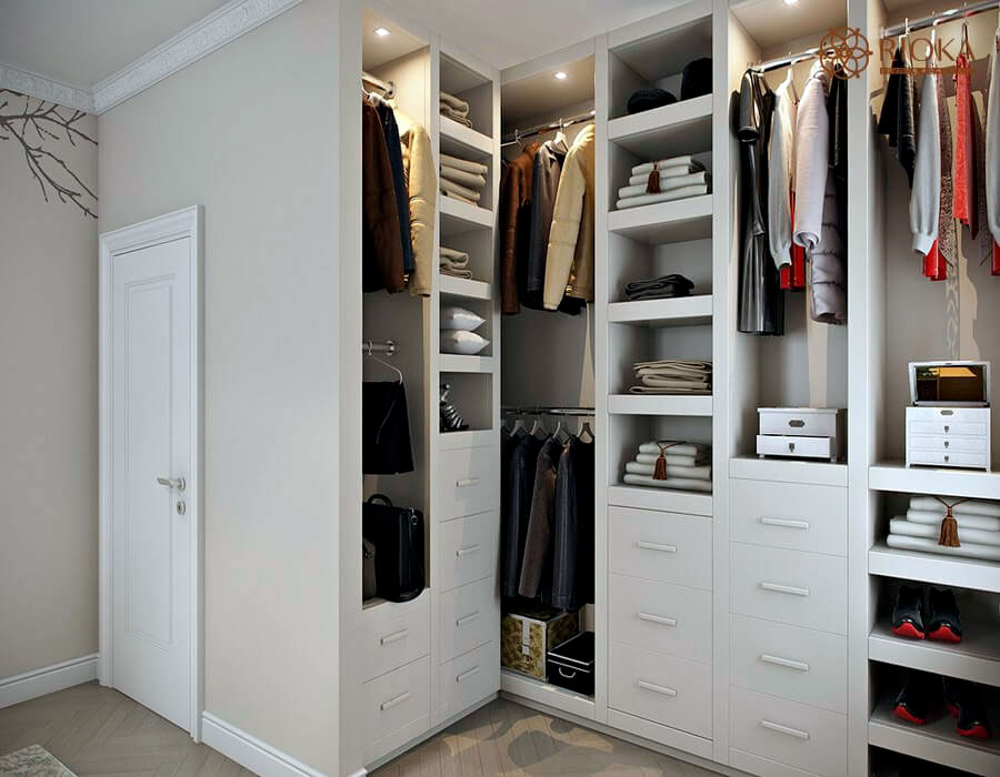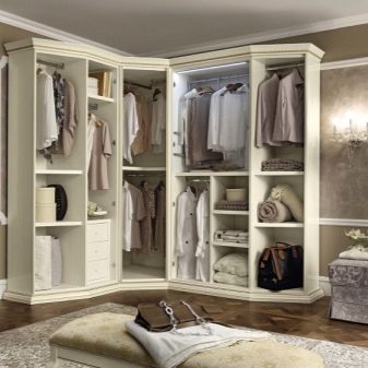 Ce sont les principales options de configuration de garde-robe utilisées à l'intérieur. De plus, les solutions d'angle peuvent être remplacées par des radiales - arrondies en 1/2 ou 3/4 sphères, mais la commande d'accessoires pour un tel système de stockage coûtera plus cher. Mais cela a l'air très impressionnant, il peut être situé le long de murs au relief complexe.