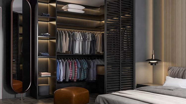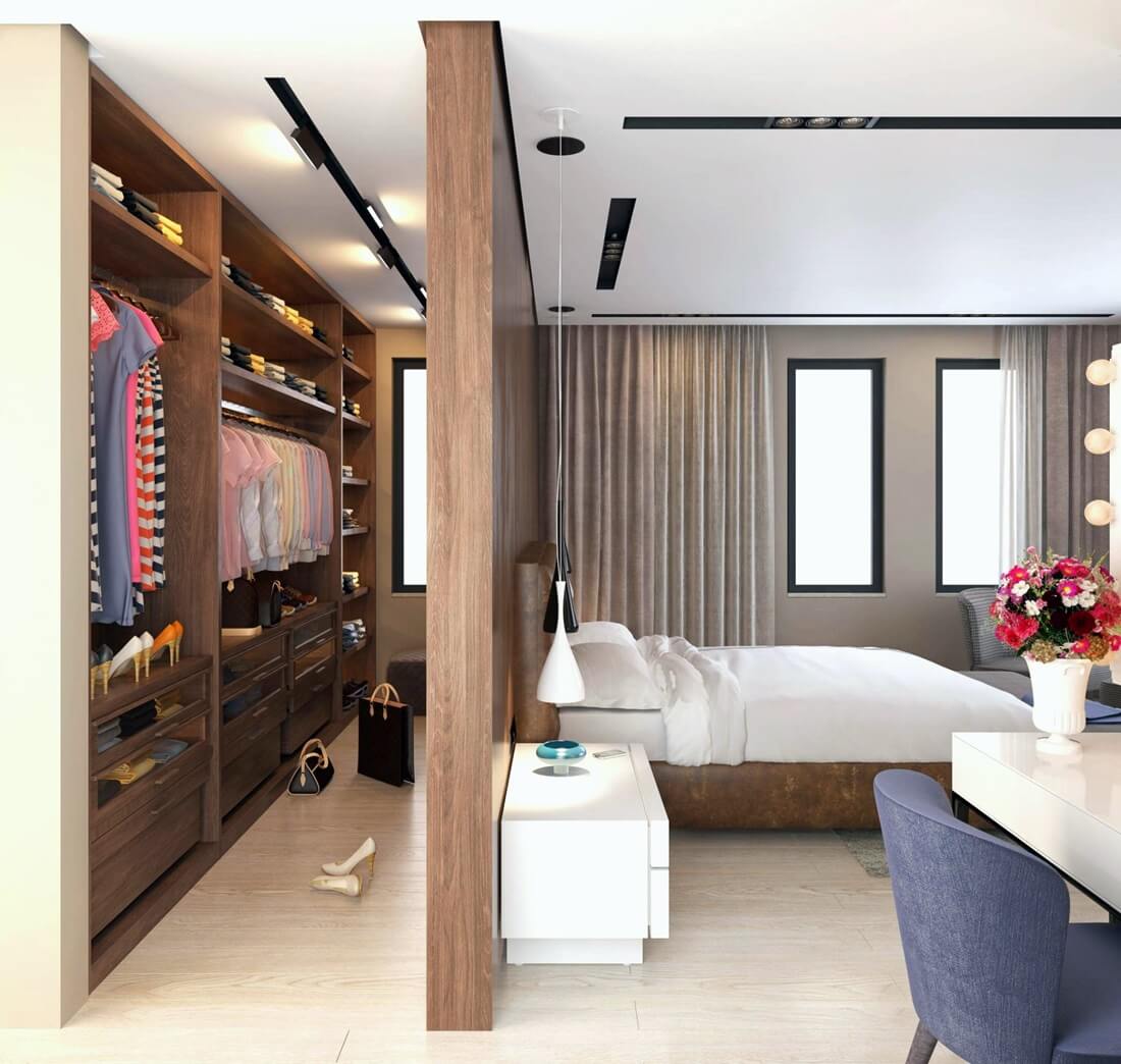 L'option la plus courante est un espace isolé avec des murs préfabriqués pour séparer le dressing du reste de la chambre.