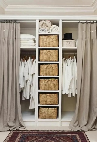 Vous pouvez compléter l'espace dressing avec des étagères ou des étagères ouvertes à l'aide de paniers en maille métallique ou de boîtes en plastique. Au niveau inférieur, vous pouvez placer des coffres doublés de cuir ou de tissu, des boîtes à linge, de la literie.