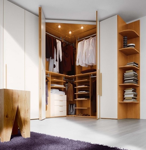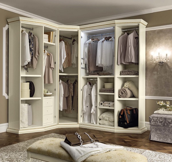 - Au coin. C'est une bonne solution pour les espaces carrés de 9 ou 16 mètres carrés. mètres. Habituellement, l'armoire est placée à l'entrée, séparant pour elle une partie du mur derrière la porte. Ceci est pratique, permet de ne pas surcharger la pièce et prend un minimum de place.