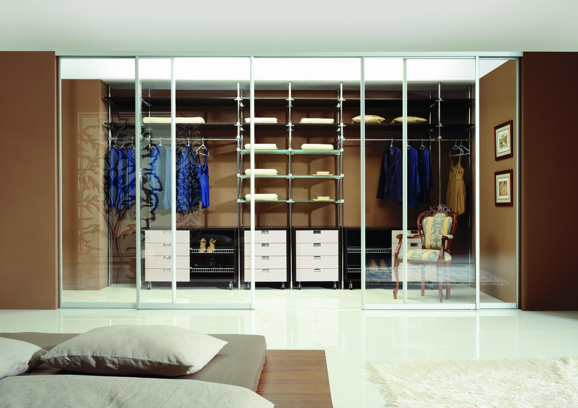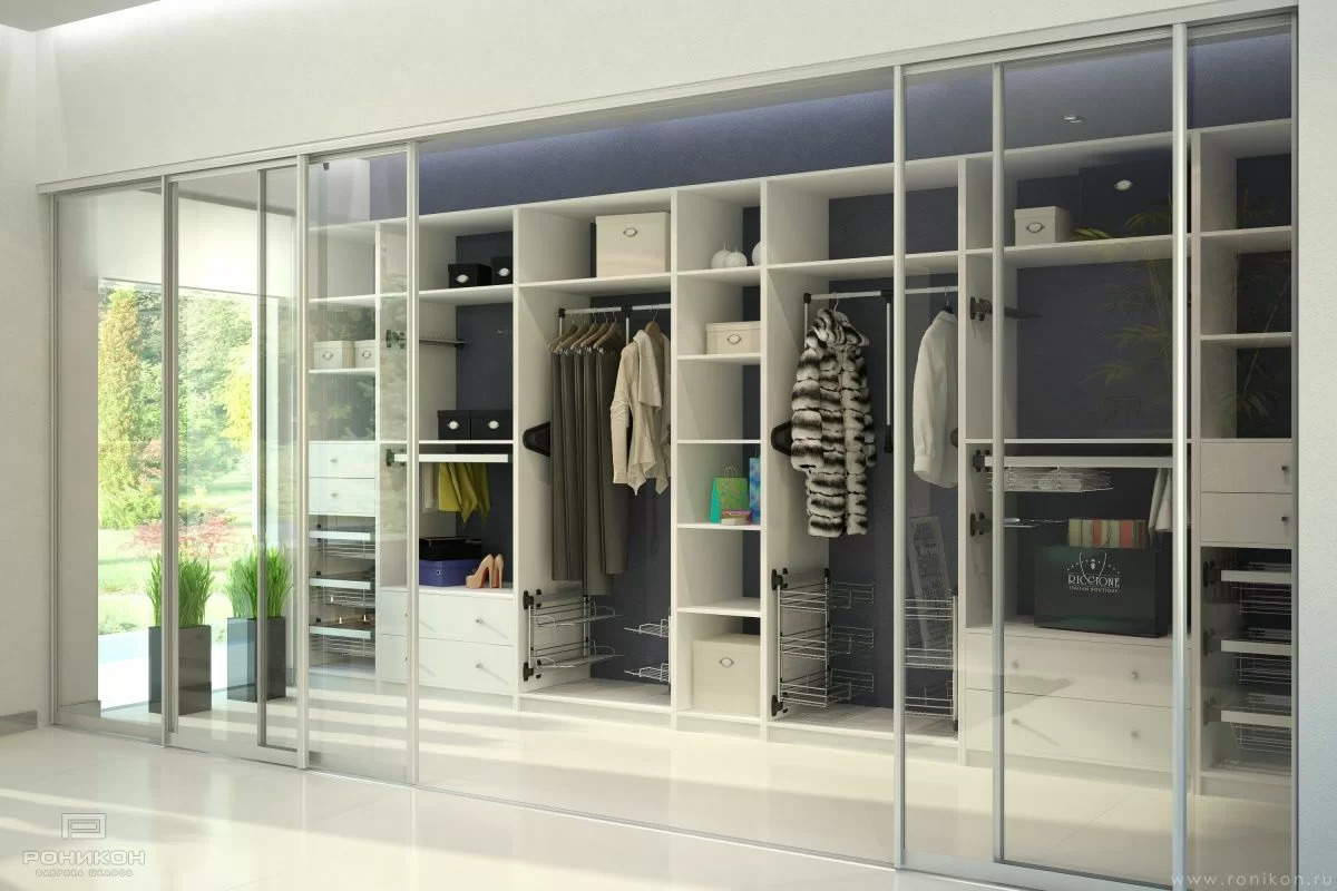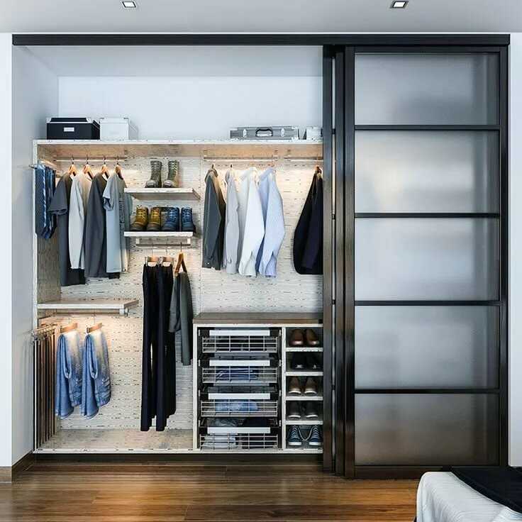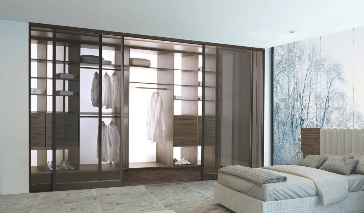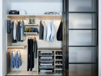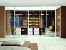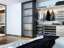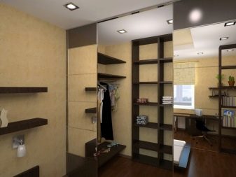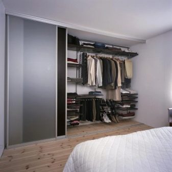 Lorsque, s'il n'y a pas assez d'espace pour une armoire, il vaut la peine de privilégier les sections ouvertes sans tiroirs coulissants. De plus, dans les petites pièces, les structures intégrées peuvent être clôturées à l'aide de murs de verre.