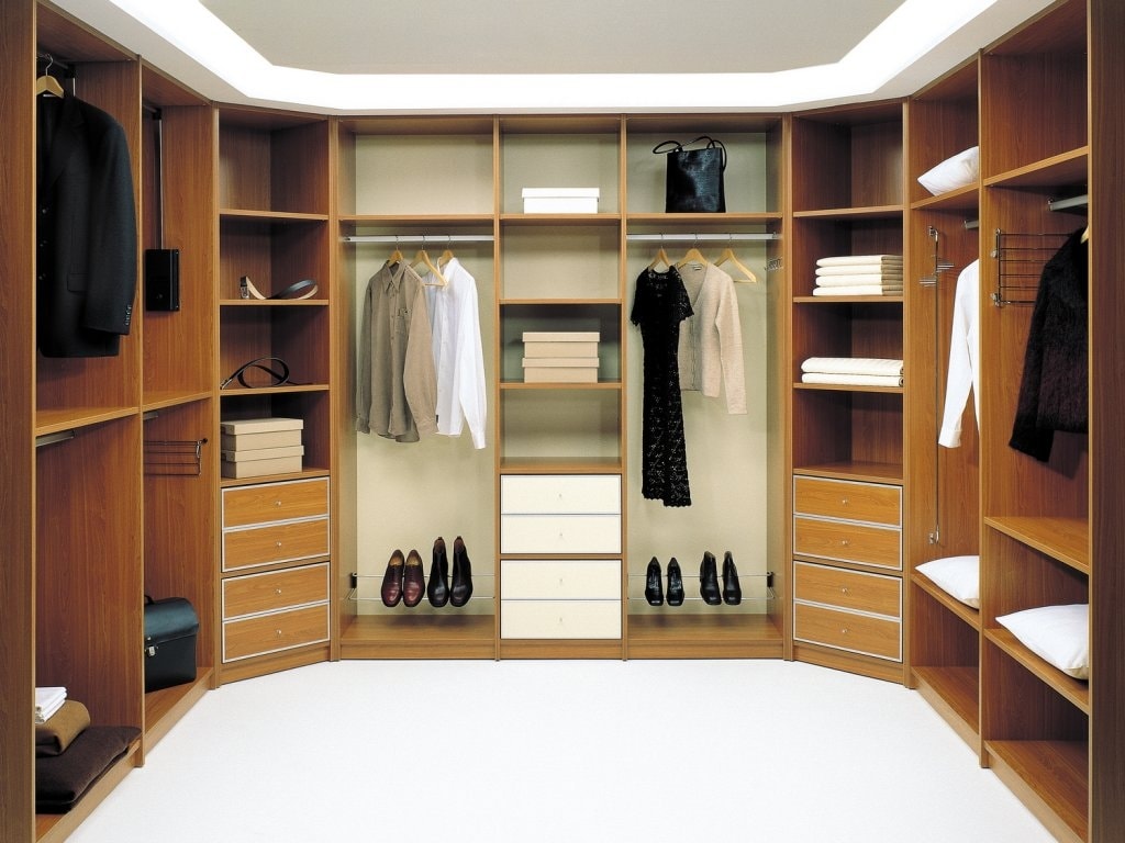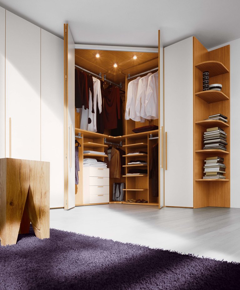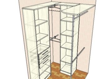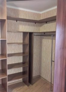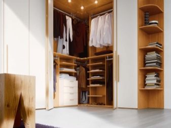 Si l'espace le permet, vous pouvez choisir l'option d'un dressing sous la forme de la lettre P ou G. Ils peuvent organiser de nombreuses étagères, compartiments, tiroirs et sections pour toutes choses, y compris même les petites choses. Les grandes structures sont mieux choisies en bois. Il est conseillé de choisir une teinte similaire à celle présente dans l'intérieur principal.