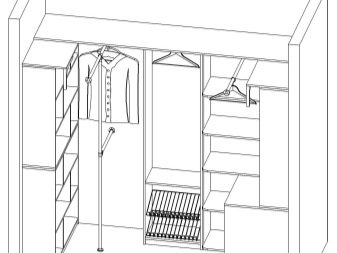 Dans la description de la taille du dressing, il faut tenir compte du fait que la barre d'extrémité peut accueillir jusqu'à 8 cintres. Dans ce cas, la hauteur des sections doit être comprise entre un mètre et un mètre et demi. Il est préférable de faire des dessins et un projet détaillé à l'avance, ce qui vous permettra de calculer avec précision la quantité de matériaux nécessaires et de réaliser correctement l'installation.