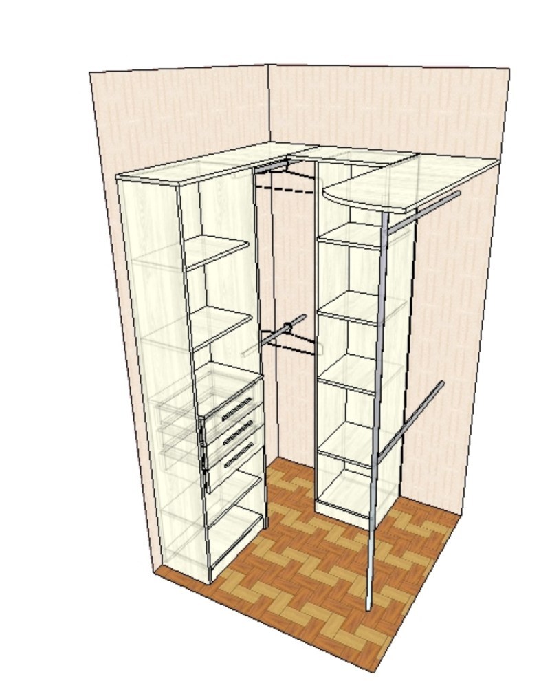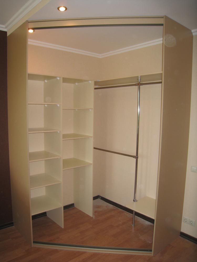 - Possibilité de coin convient aux pièces de taille limitée. Même la plus petite armoire reste assez fonctionnelle. Il peut être placé dans les coins intérieurs et extérieurs. L'armoire intégrée peut être en forme de triangle, de trapèze ou de demi-cercle.