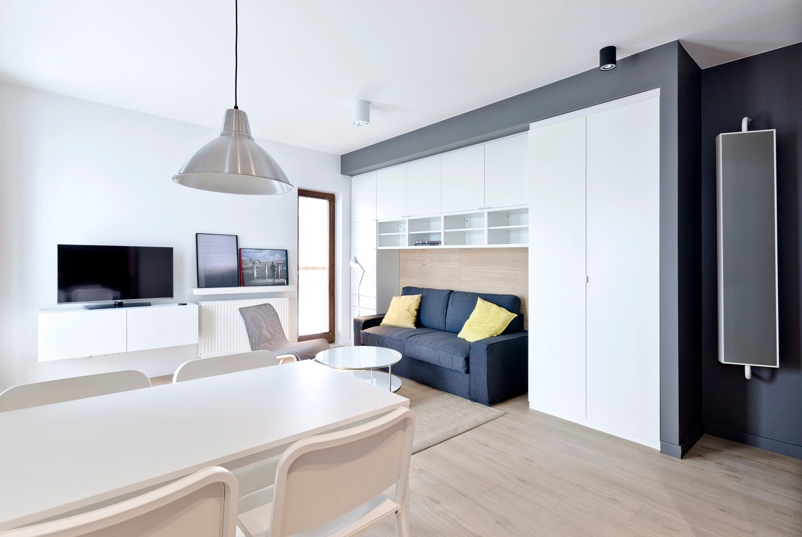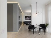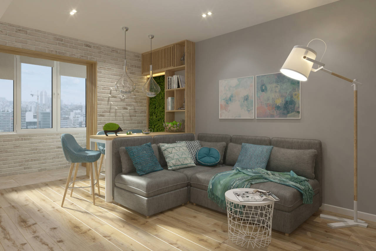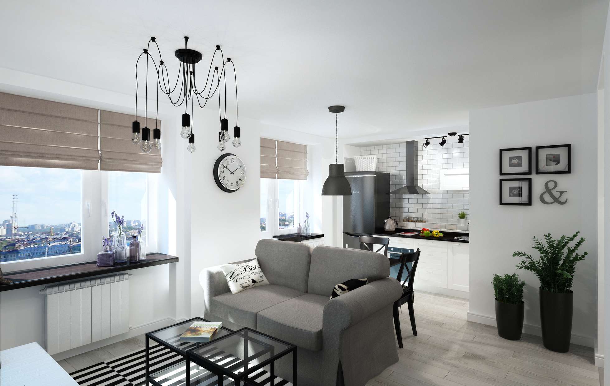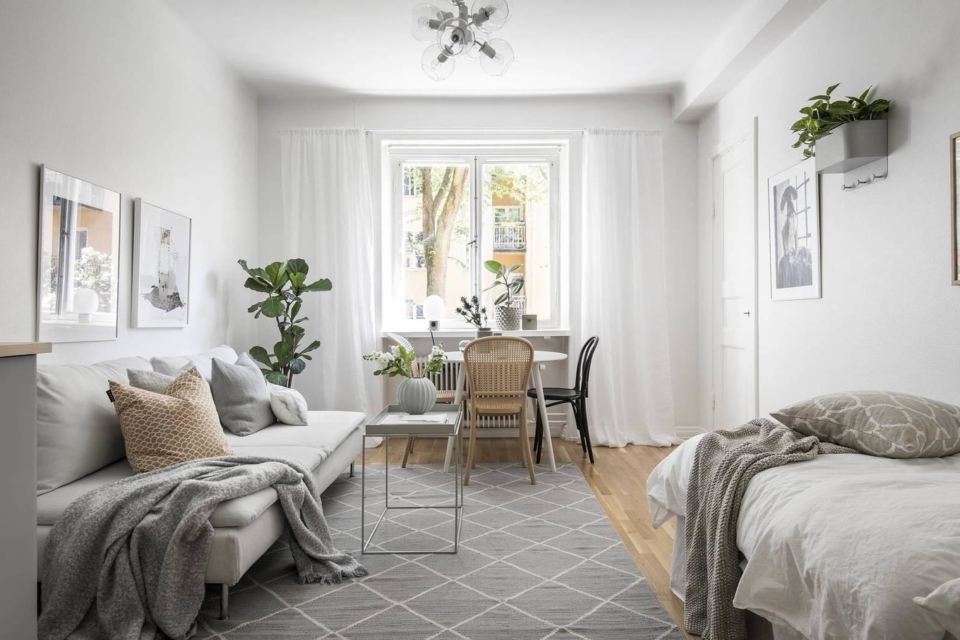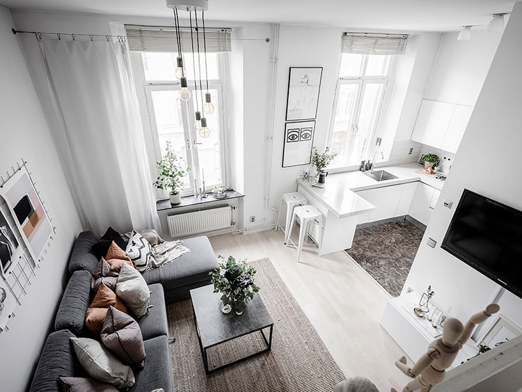 - Un petit appartement, décoré principalement dans des couleurs blanches, aura l'air très élégant et frais.... Un canapé d'angle gris, une table basse sombre, un tapis de sol gris pâle et une télévision murale noire seront harmonieux ici. Les derniers détails dilueront efficacement la blancheur du décor scandinave.