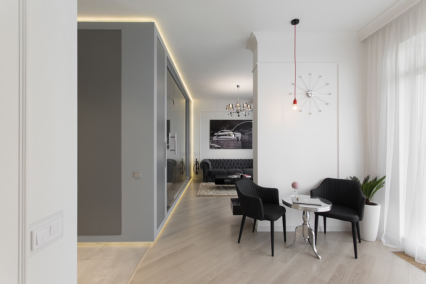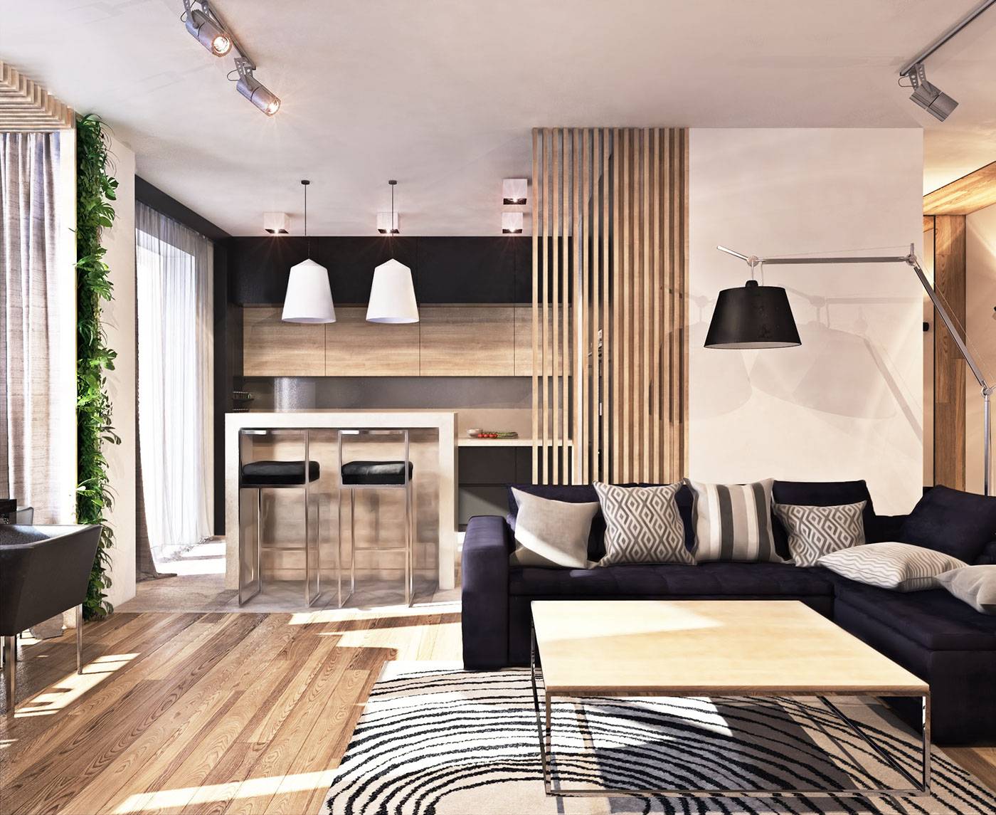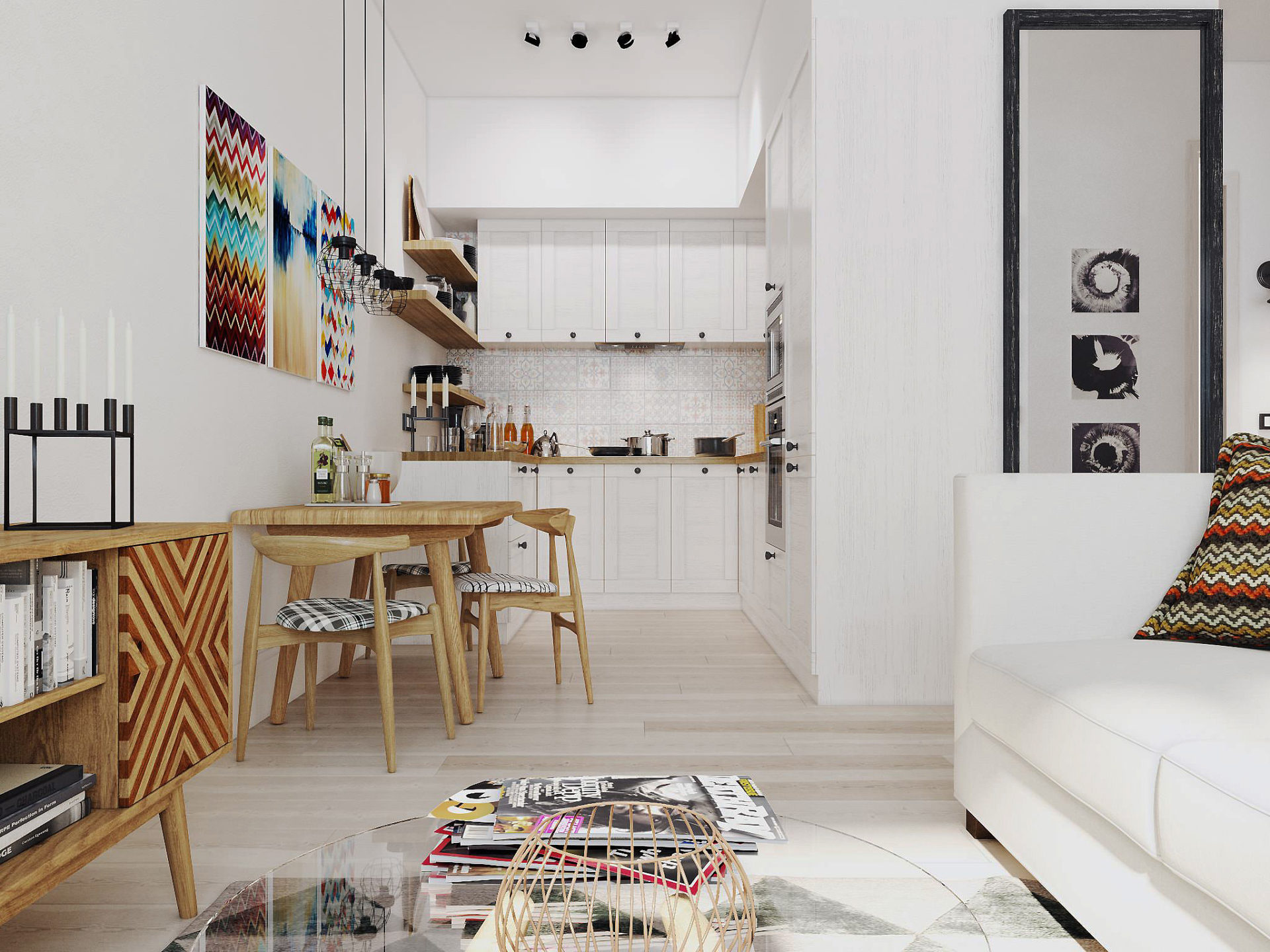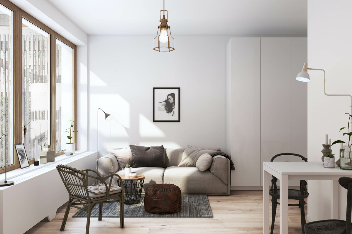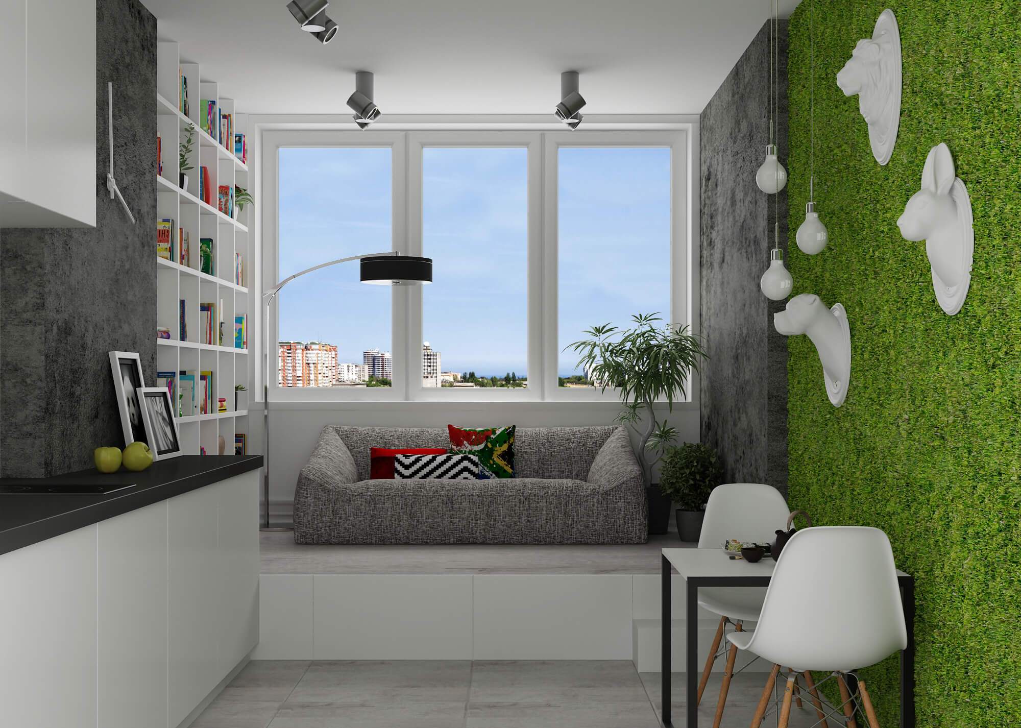 - Un petit appartement, décoré principalement dans des couleurs blanches, aura l'air très élégant et frais.... Un canapé d'angle gris, une table basse sombre, un tapis de sol gris pâle et une télévision murale noire seront harmonieux ici. Les derniers détails dilueront efficacement la blancheur du décor scandinave.